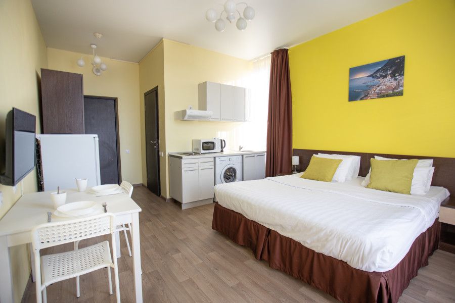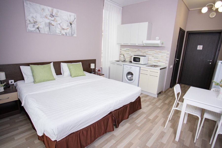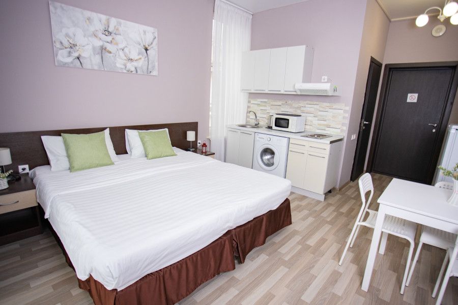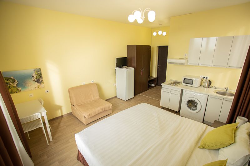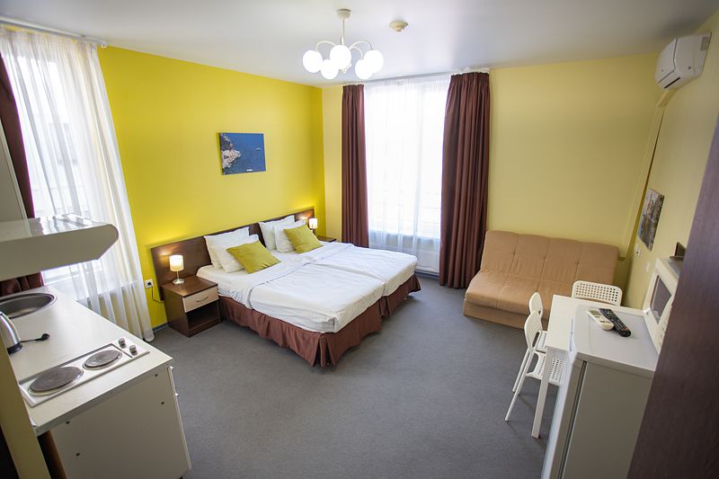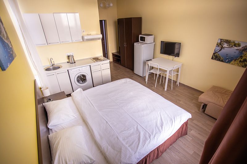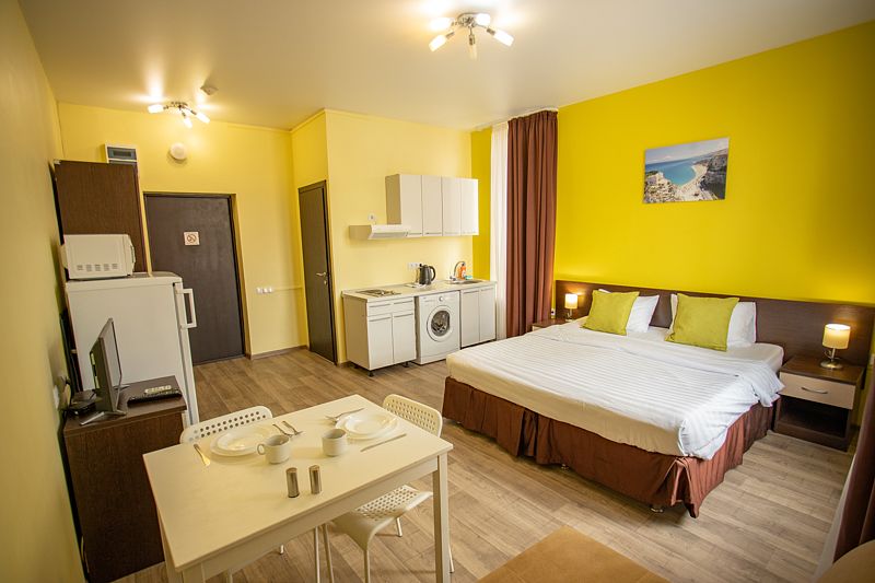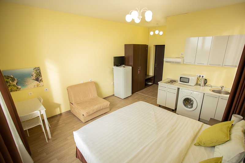 Пятиэтажный корпус, в котором разместились Апартаменты, возвышается на первой береговой линии. В номерах дизайнерский интерьер и есть все необходимое для комфортного пребывания. Все Апартаменты оснащены индивидуальным санузлом с ванной, собственной кухней, оборудованной посудой и бытовой техникой, также в номерах есть кондиционер, плазменный телевизор, а ванных комнатах — фен и наборы косметических принадлежностей для гостей.