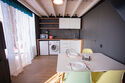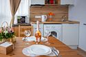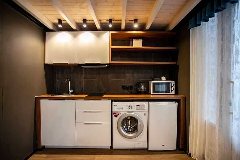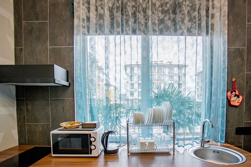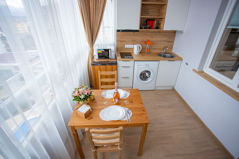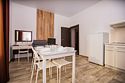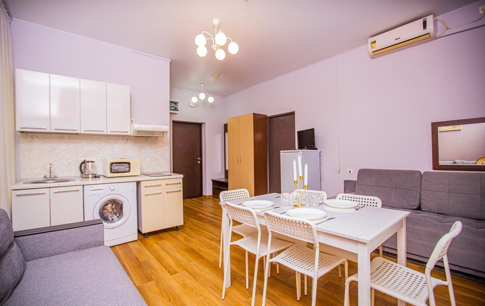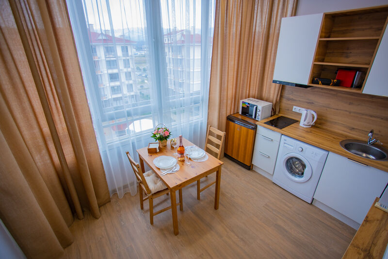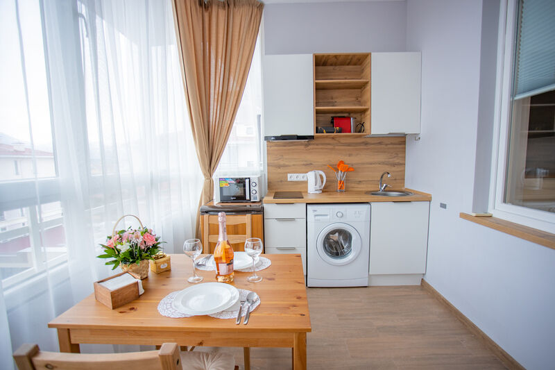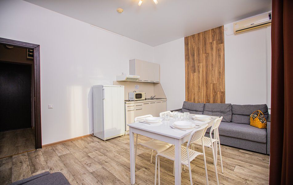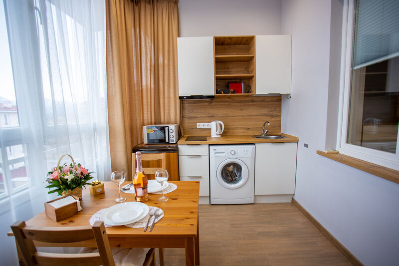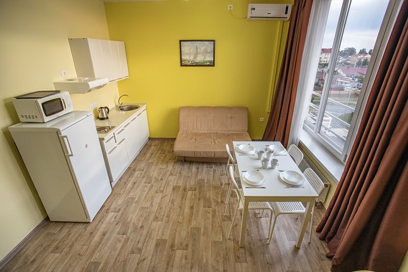 Пятиэтажный корпус, в котором разместились Апартаменты, возвышается на первой береговой линии. В номерах дизайнерский интерьер и есть все необходимое для комфортного пребывания. Все Апартаменты оснащены индивидуальным санузлом с ванной, собственной кухней, оборудованной посудой и бытовой техникой, также в номерах есть кондиционер, плазменный телевизор, а ванных комнатах — фен и наборы косметических принадлежностей для гостей.