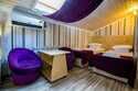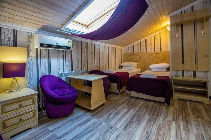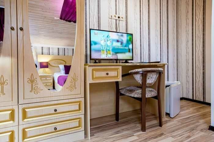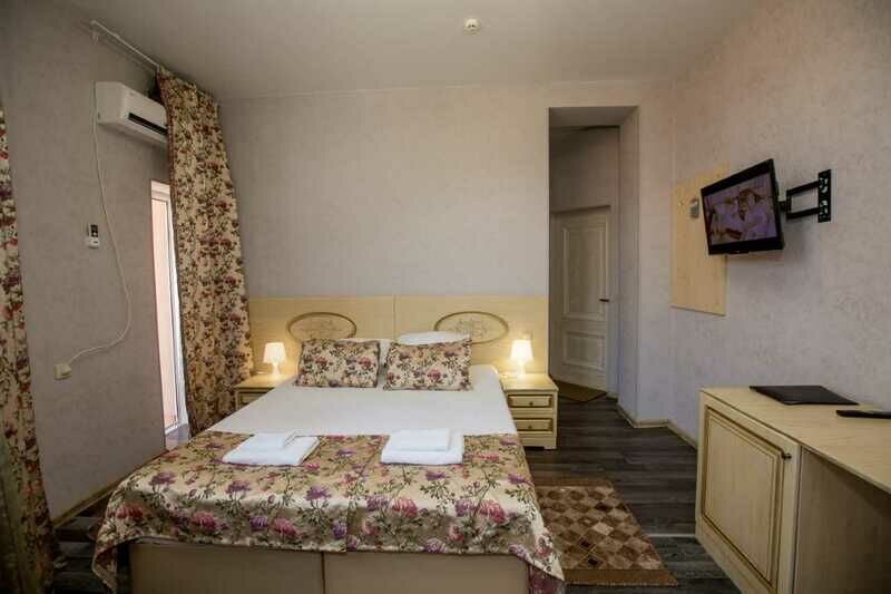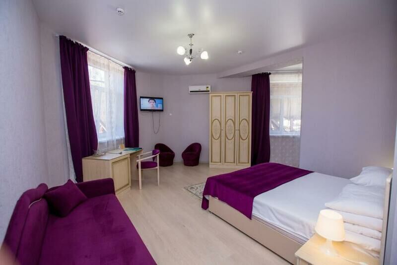 Трехэтажное здание (без лифта) занимает небольшую благоустроенную и закрытую территорию. Комфортабельные номера имеют стандартную, семейную и комфортную категорию. Номера оформлены в современном и светлом стиле и ярко оформлены в благородных фиолетовых тонах. Во всех номерах есть ванная комната с косметическими принадлежностями для гостей, кондиционер, плазменный телевизор, электрический чайник.