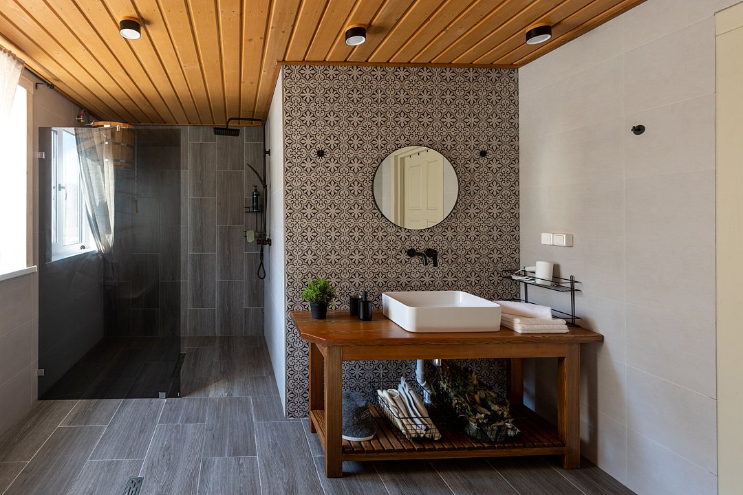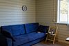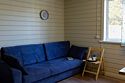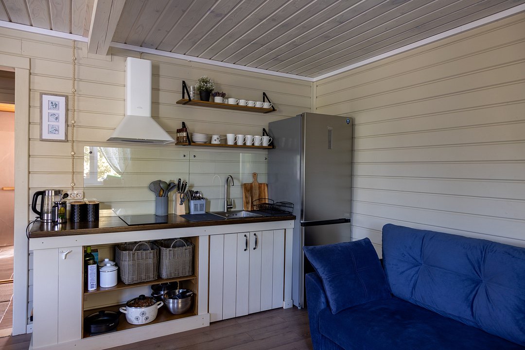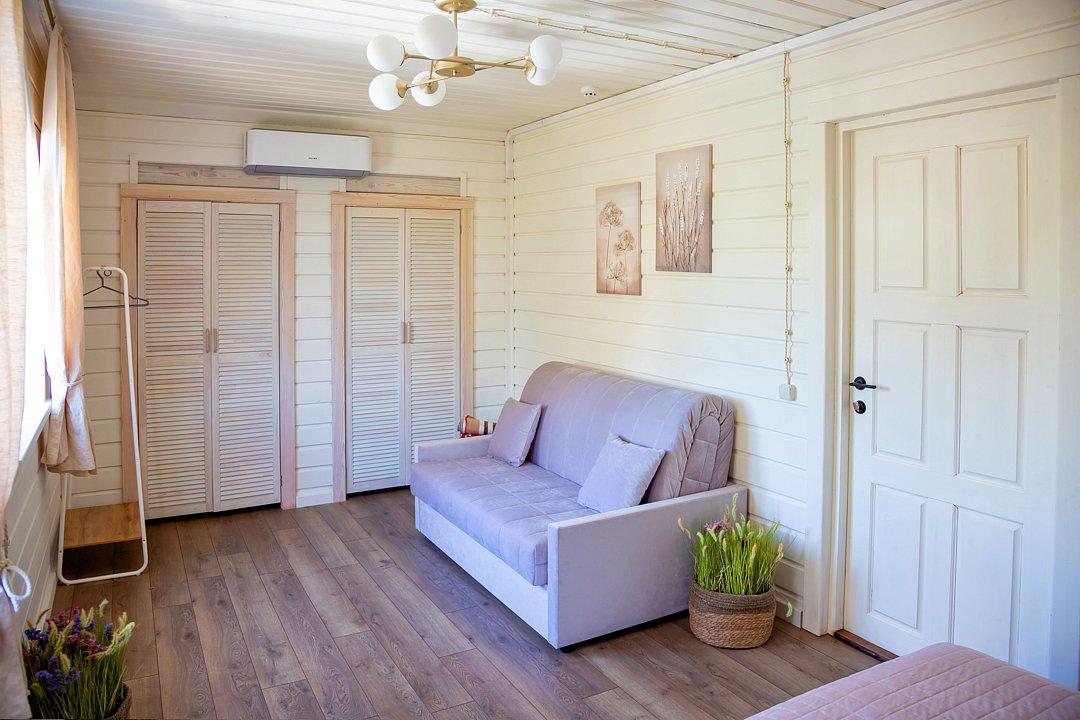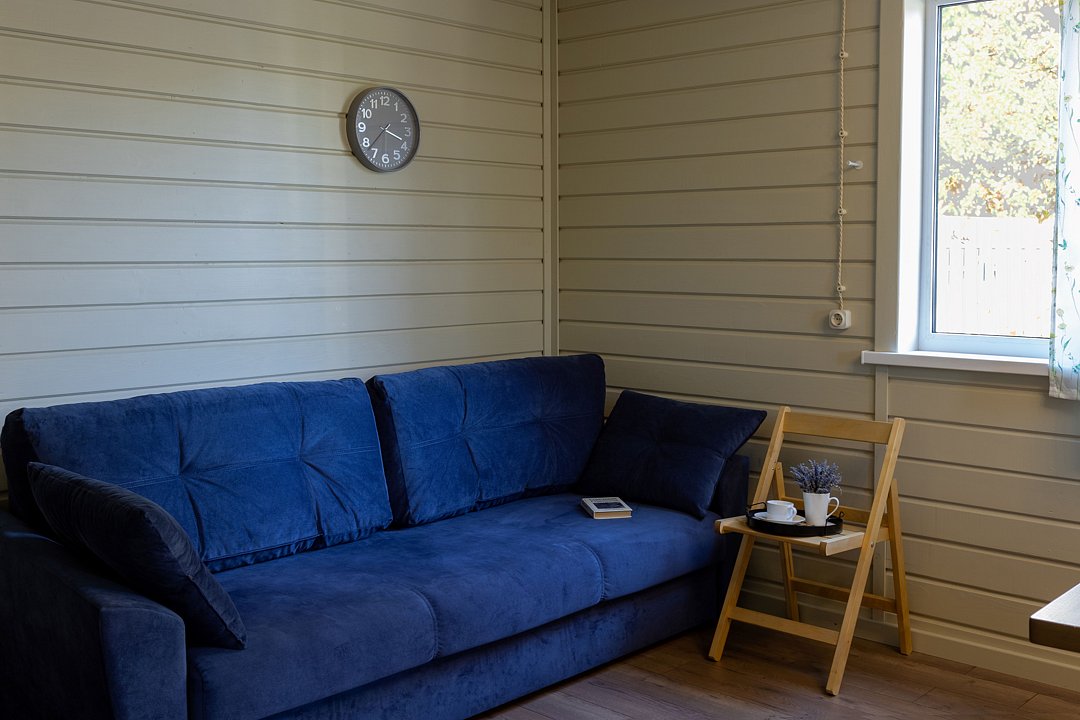Дом идеально подходит для комфортного проживания компании до десяти человек. На первом этаже находится большая светлая гостевая комната с уютным диваном, где можно провести время за общением или просмотром фильмов. Здесь же расположен санузел, что добавляет удобства для гостей.