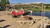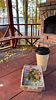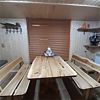В каждом коттедже открытая терраса с видом на озеро столом и скамеечками.