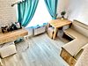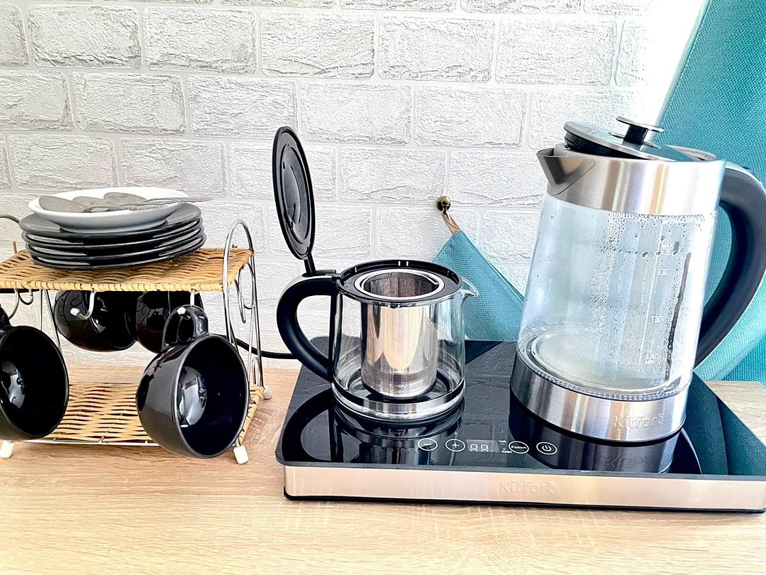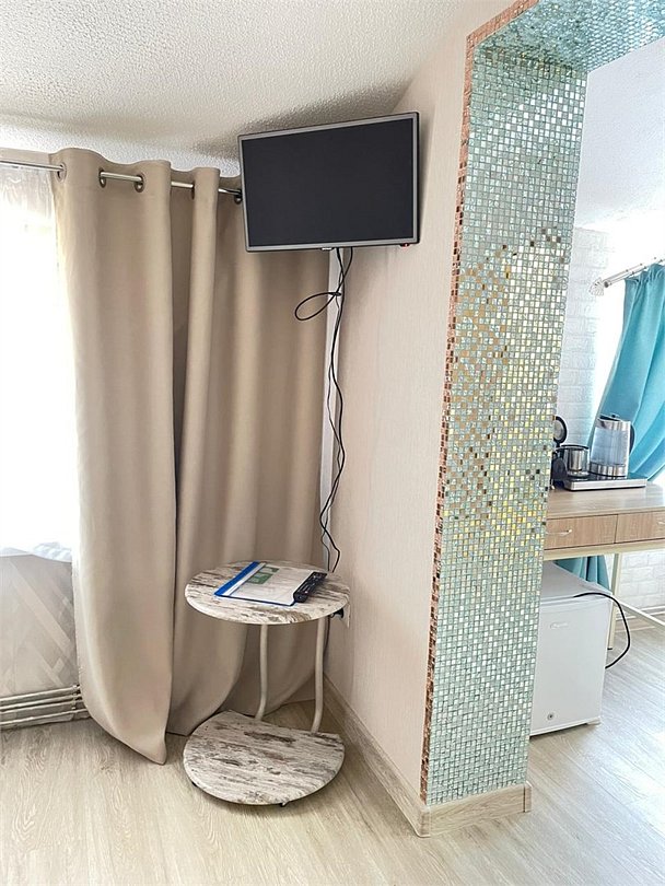 Гостиная с мини-кухней включает: холодильник, СВЧ печь, мультиварка, эл. чайник, посуда, муз. центр, кухонный уголок.