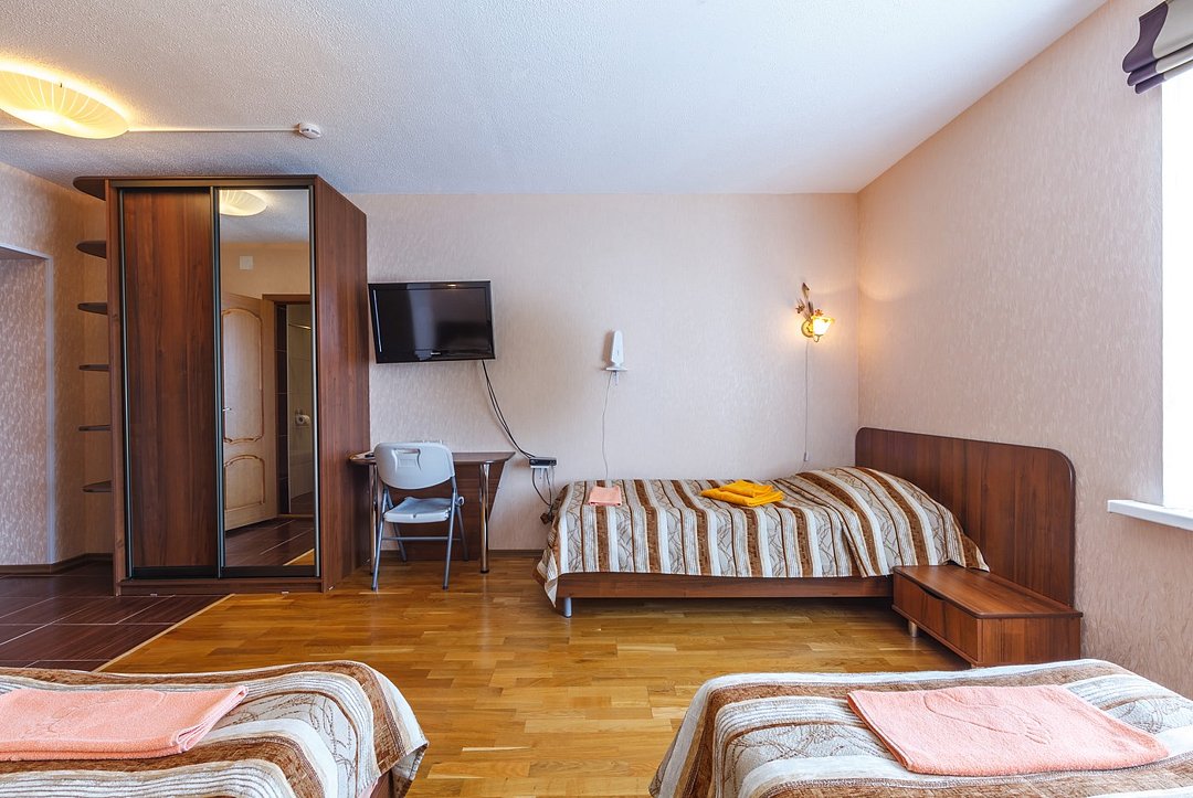 Wi-Fi, светильник, санузел, банные полотенца, тумбы, стулья, зеркало, унитаз, отопление, душ, три односпальные кровати, ламинат, стаканы, стол, туалетные средства, туалет, цифровое тв, телевизор с плоским экраном, мини-холодильник, шкаф-купе, гостиничная парфюмерия, вид на озеро, вид на залив, теплые полы, вешалки-плечики, затемняющая штора, без питомцевВ номере