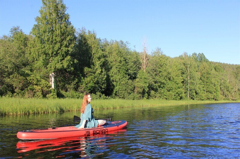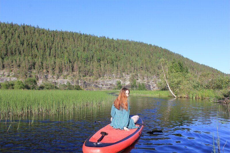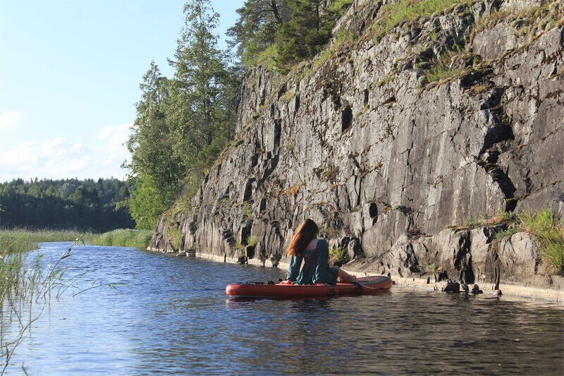 Исследуйте живописные берега реки Сумерианйоки с помощью САП-борда — это идеальный способ насладиться природой и активным отдыхом, любуясь великолепными видами, включая величественную отвесную скалу, которая станет прекрасным фоном для ваших снимков.
