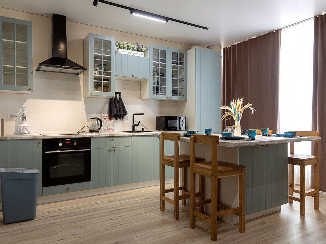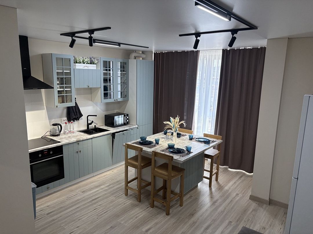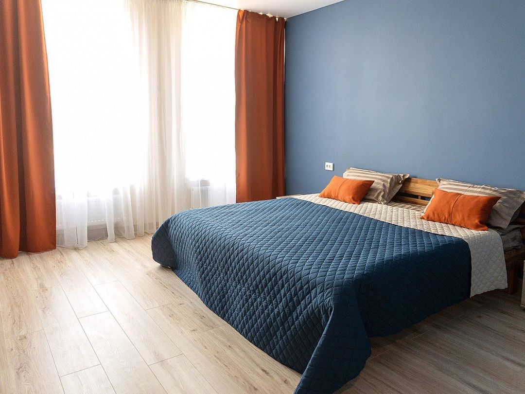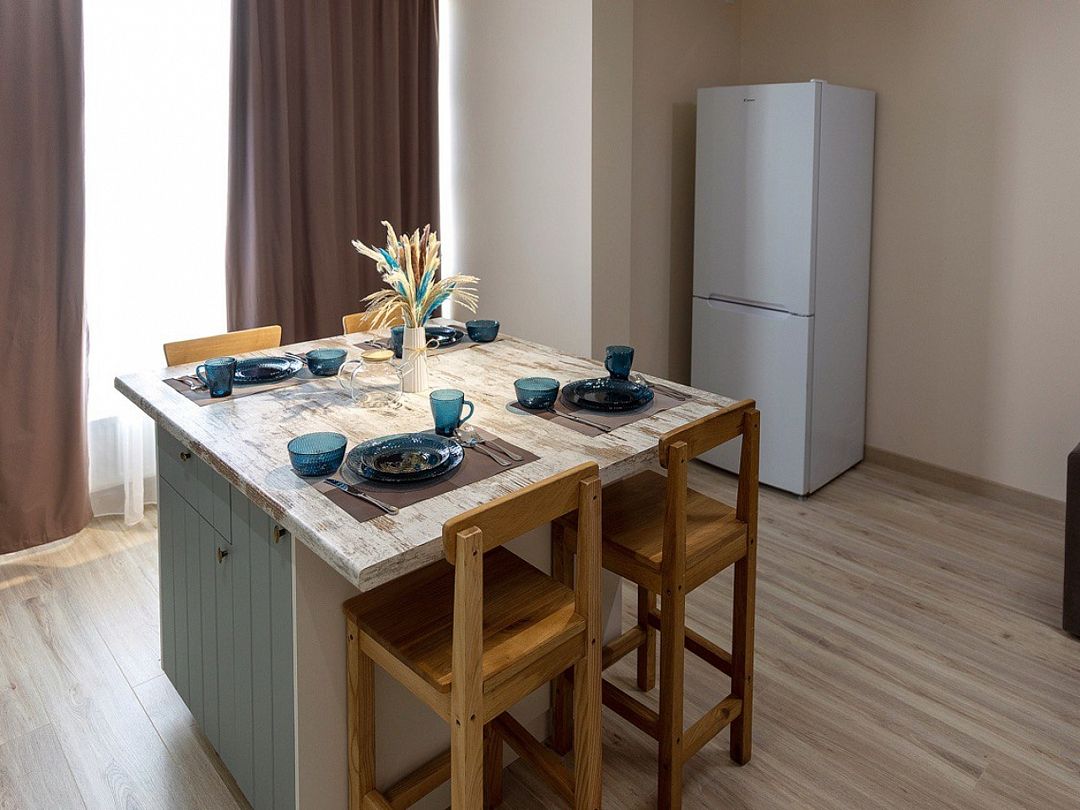 Внутри квартиры гостей ждет полный набор бытовой техники и удобств: от кондиционера и Wi-Fi до современной кухни с кофемашиной, микроволновкой, духовым шкафом и посудомоечной машиной. Особое внимание уделено качеству сна — большая дубовая кровать с ортопедическим матрасом Аскона и анатомическими подушками подарит полноценный отдых.