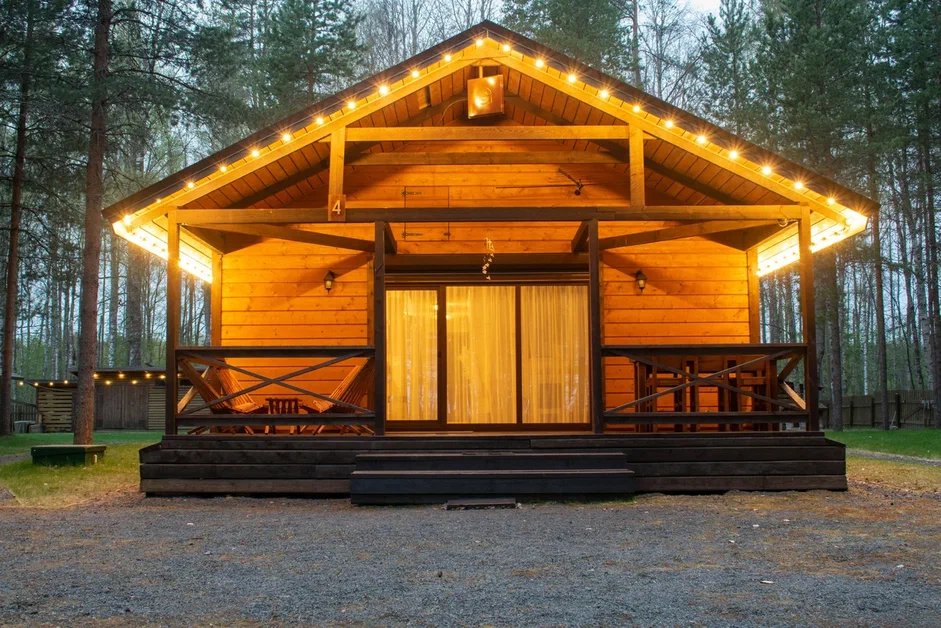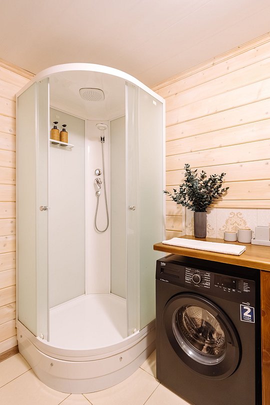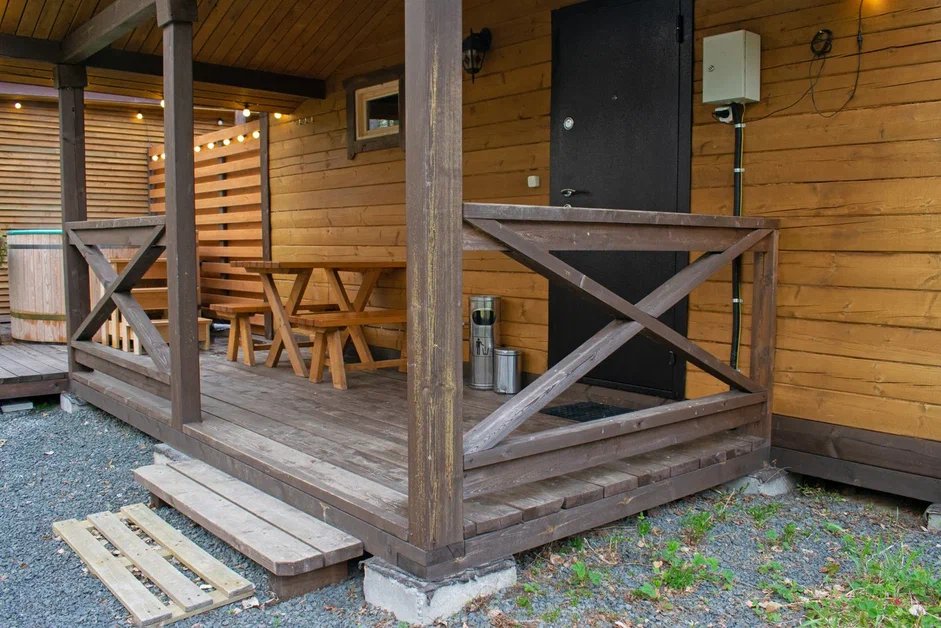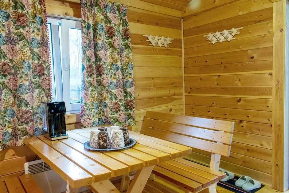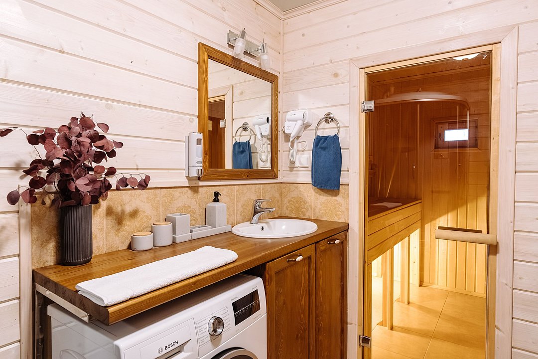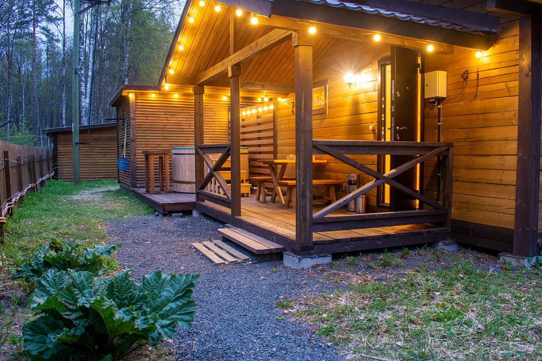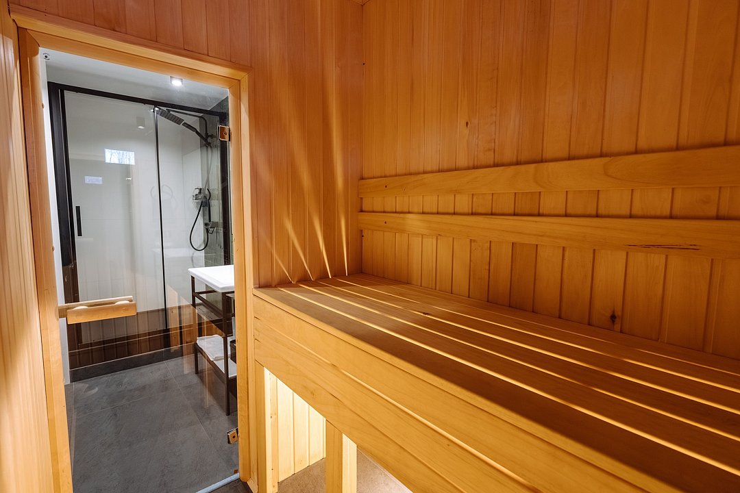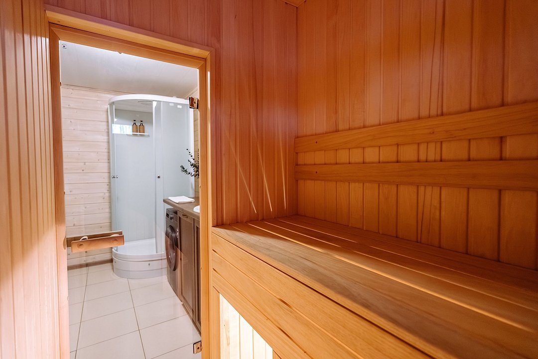 Каждый коттедж оснащен собственной сауной, что позволяет гостям окунуться в атмосферу спокойствия и уединения, не выходя из дома.