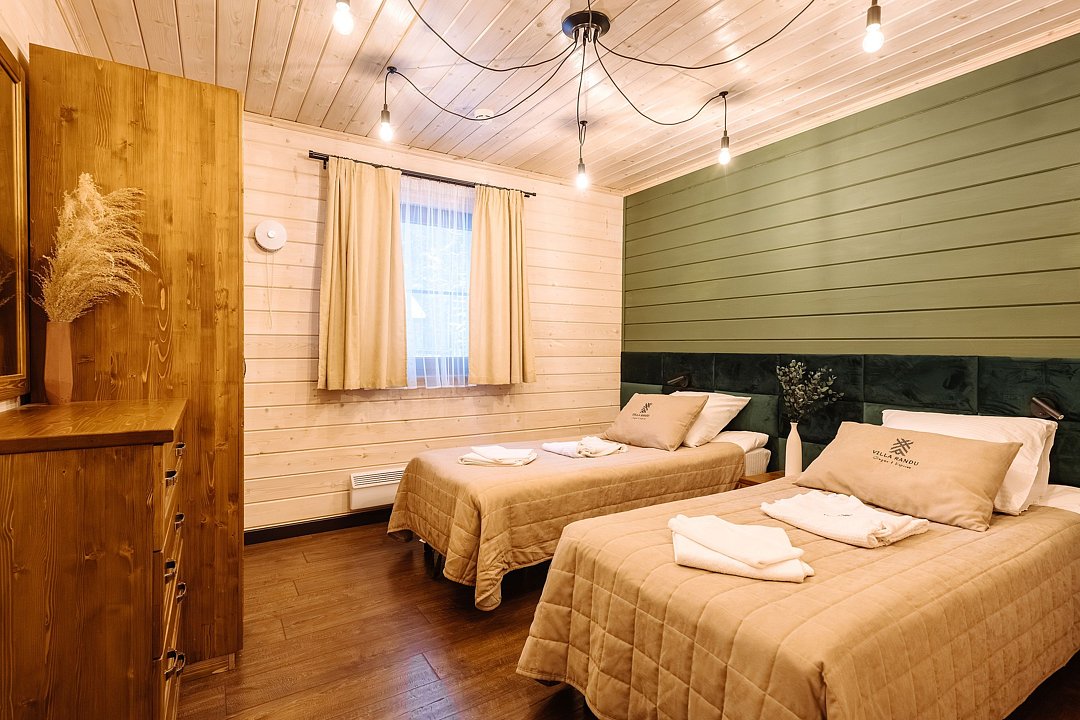 - Двуспальная кровать в одной спальне, во второй спальне — две односпальные кровати и одна двухъярусная кровать,