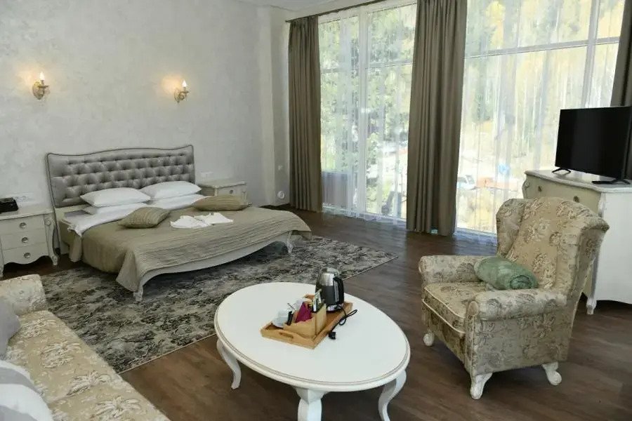 Для размещения предусмотрены просторные номера трех категорий с живописным вид на лес или горы. В некоторых номерах – панорамное окна от пола до потолка, через которые проникает естественное освещение и открываются невероятные виды. В каждом номере - современная удобная и стильная мебель, ТВ, холодильник, чайная станция, просторный санузел, ванные принадлежности, халаты, тапочки.