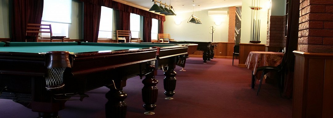 Для игры в «Русский бильярд» установлены два 12-ти футовых стола, один 10-ти футовый и стол «Американского» пула, в перерывах между поединками к Вашим услугам бар-кафе, где сможете выпить и поужинать.