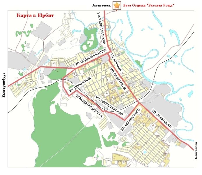 Выезд из Екатеринбурга на Режевской тракт, ехать по прямой, далее уходите на г. Артемовский (направо), затем по главной дороге до перекрёстка с указателем "г. Ирбит", едете прямо на «Ирбит». Затем прямо до п.Зайково, далее до "Т" - образного перекрёстка (перед Вами стоит магазин «Карина»), на перекрёстке уходите влево, далее до "Т" - образного перекрёстка, на перекрёстке уходите влево по указателю "г. Ирбит". Заезжаете в г. Ирбит, далее по ул. Карла Маркса выезжаете из города, после моста поворачиваете направо на просёлочную дорогу
