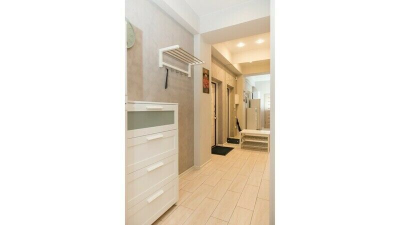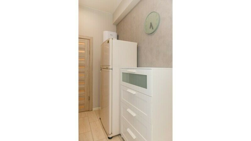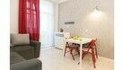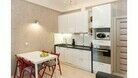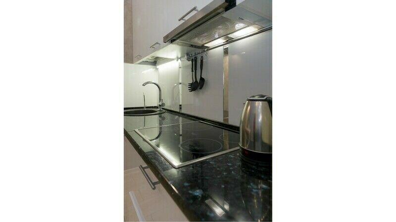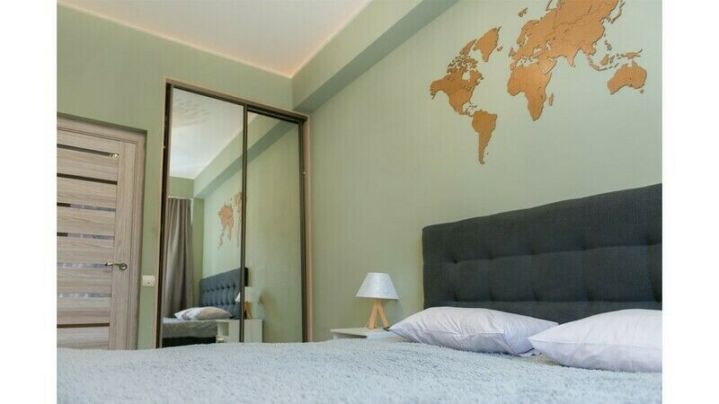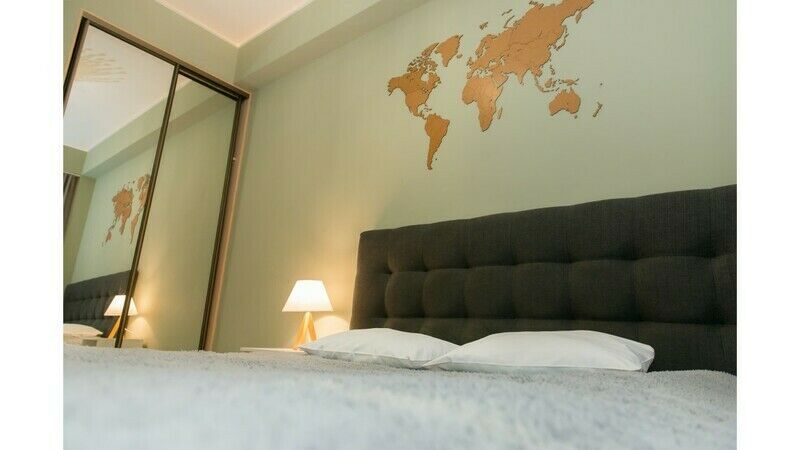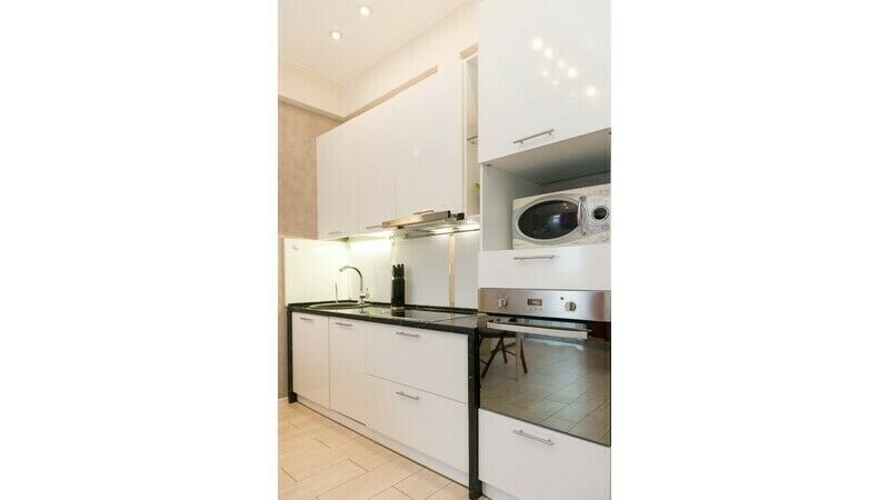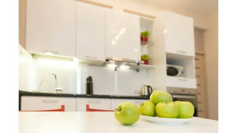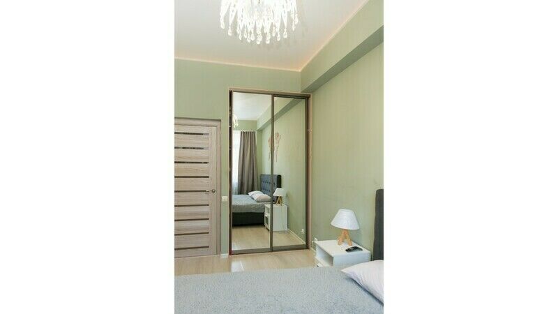 В апартаментах есть все необходимое - двуспальная кровать, раскладной диван, кухня с набором посуды и техникой и санузел с гидромассажной ванной.
