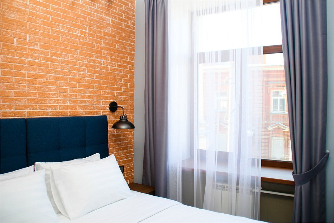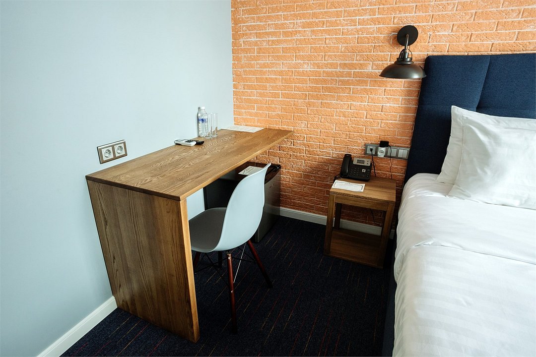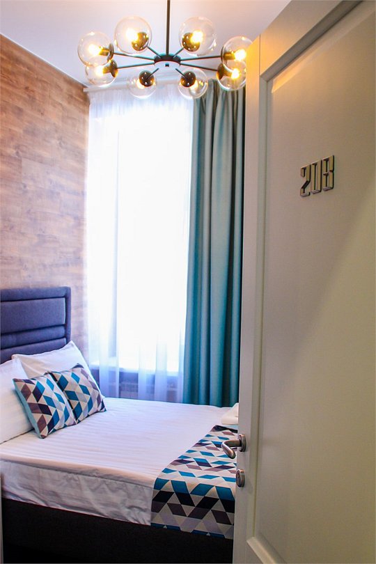 Номера исполнены в стилях "Лофт" и "Деко". Такое направление дизайна как «Лофт» зародилось в Америке в начале прошлого века. Так назывались промышленные территории, переделанные в жилые пространства в связи с высокой стоимостью недвижимости. Поселялись в «Лофтах» в основном люди искусства, и вскоре обитаемые чердаки и цеха стали восприниматься как места с богемной атмосферой. В номерах, выполненных в стиле «Лофт» кирпичные стены и причудливых форм металлические светильники. Деревянная мебель из ясеня создает атмосферу тепла и комфорта. Ковровое покрытие синего цвета идеально сочетается с кроватью и кирпичными стенами. Стиль «Деко» – легкое, изящное, эклектичное направление в дизайне, которое успешно объединяет в себе отпечатки различных культур и стилей. Для него характерна роскошь, элегантность цвета, оригинальность и причудливые формы. Это направление появилось в 30-х годах 20 века в странах Америки и Западной Европы в результате синтеза нескольких стилей, успешно заменив Модерн. Для стиля «Деко» характерно большое количество места и света, использование разных элементов декора интерьера. Номера в этом стиле выполнены в мягкой цветовой гамме: сочетание бирюзового и бежевого цветов. Геометрических формы прекрасно сочетаются с изящными узорами. В номерах стоит кровать-конструктор, которая при необходимости трансформируется в одну двуспальную кровать размером 180 x 190 см (сдвига не чувствуется) или две раздельные кровати размером 90 x 190 см каждая.Услуги и удобства