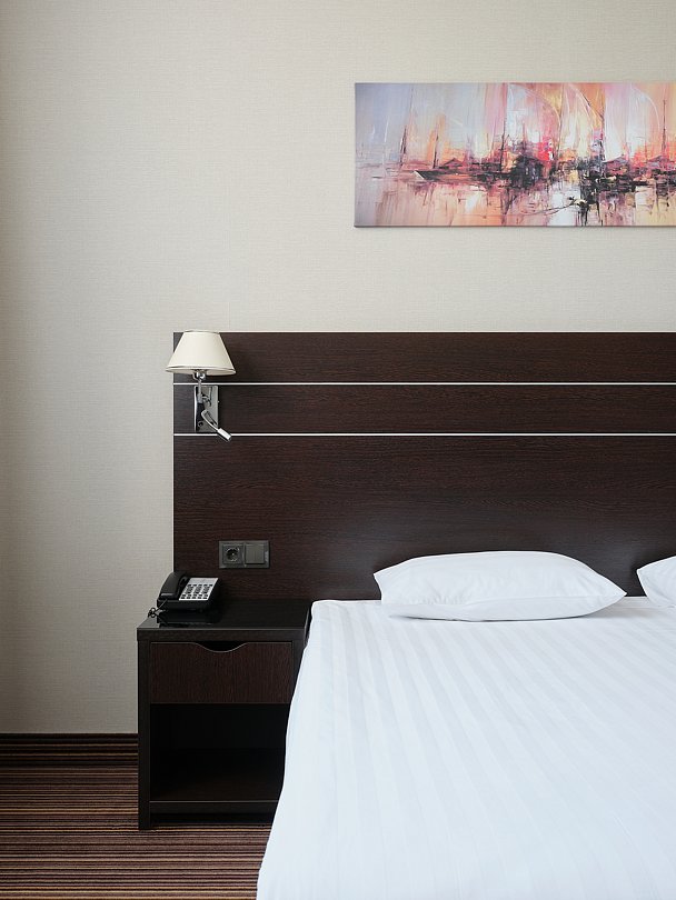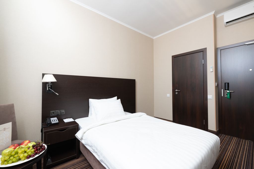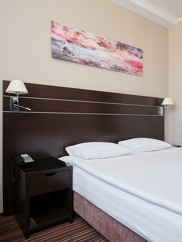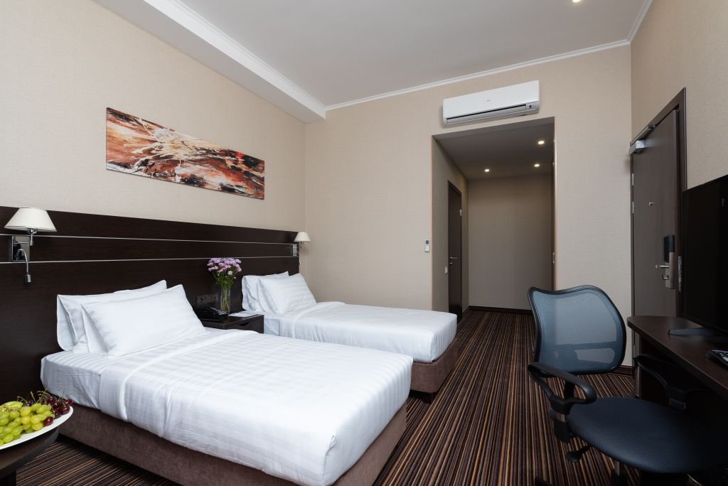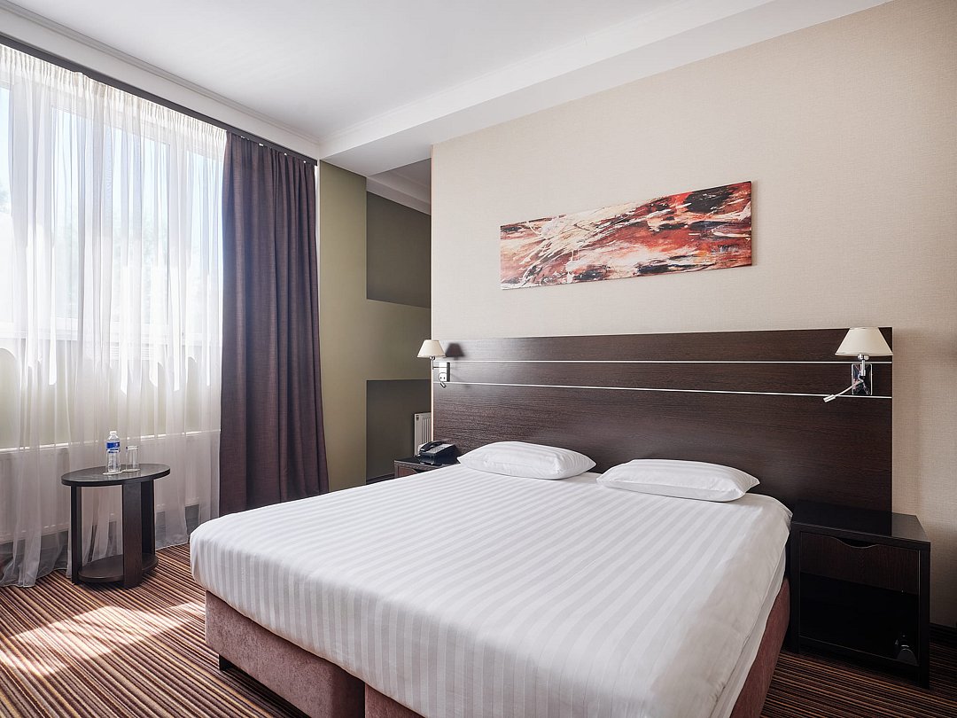 Оборудован эргономичной и функциональной мебелью, с использованием экологичных материалов и новейших технологий. Номер площадью 21 м2 с системой электронного доступа. Две кровати с ортопедическим матрасом, с возможностью объединения в одну большую кровать. Мини-бар, кофейные и чайные принадлежности. Фен, халаты, тапочки и косметический набор для каждого гостя. Индивидуальный сейф. Бесплатный вайфай.