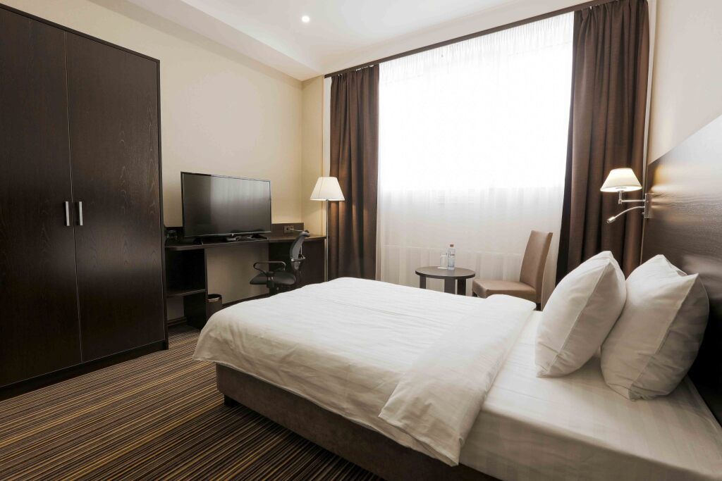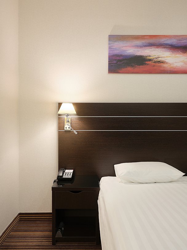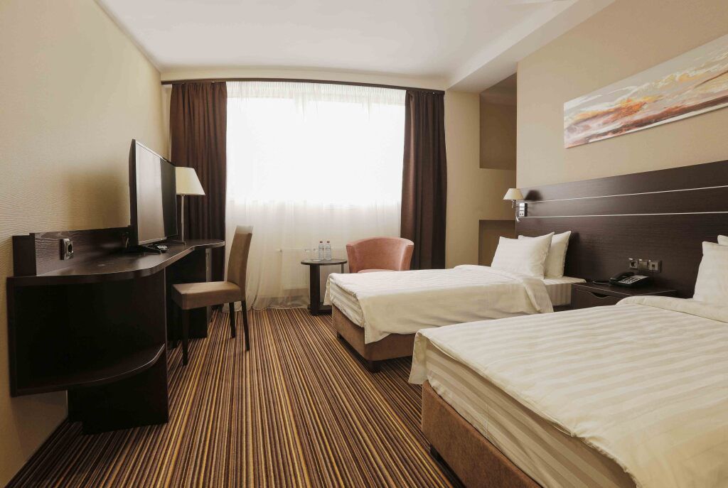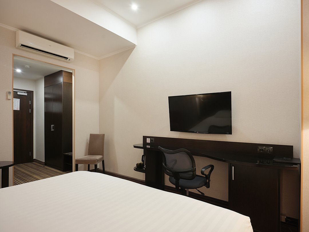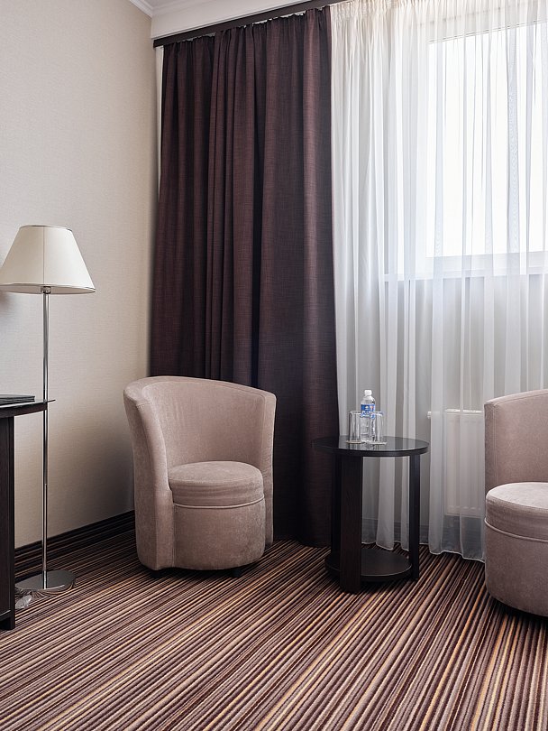 Оборудован эргономичной и функциональной мебелью, с использованием экологичных материалов и новейших технологий. Номер площадью 21 м2 с системой электронного доступа. Две кровати с ортопедическим матрасом, с возможностью объединения в одну большую кровать. Мини-бар, кофейные и чайные принадлежности. Фен, халаты, тапочки и косметический набор для каждого гостя. Индивидуальный сейф. Бесплатный вайфай.
