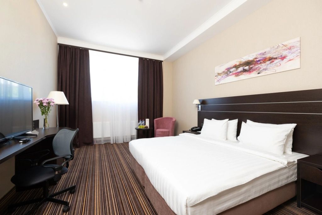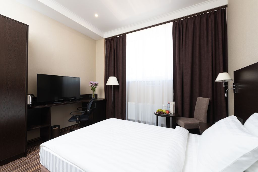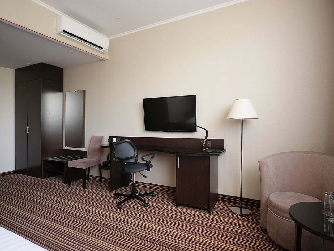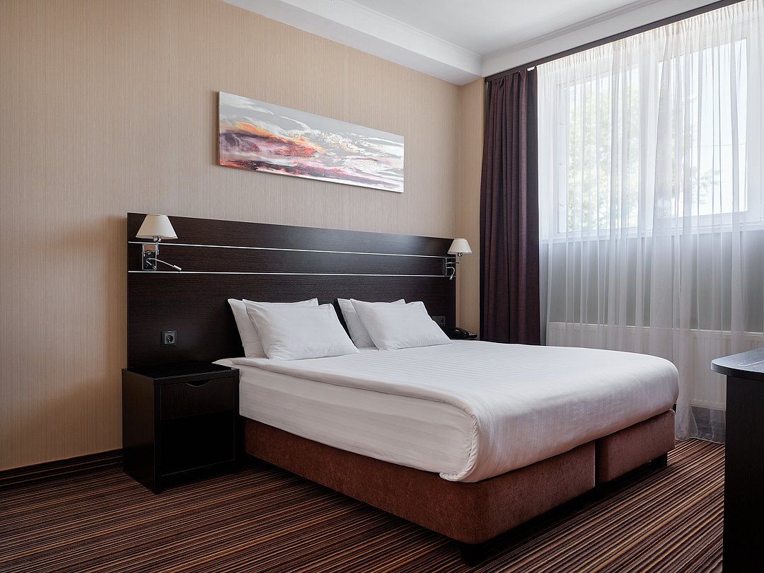 Уютный номер по приятной цене для отдыха и работы.Оборудован эргономичной и функциональной мебелью, с использованием экологичных материалов и новейших технологий. Просторная кровать с ортопедическим матрасом. В номере есть мини-бар, кофейные и чайные принадлежности. Фен, халаты, тапочки и косметический набор для гостя. Индивидуальный сейф. Бесплатный вайфай.