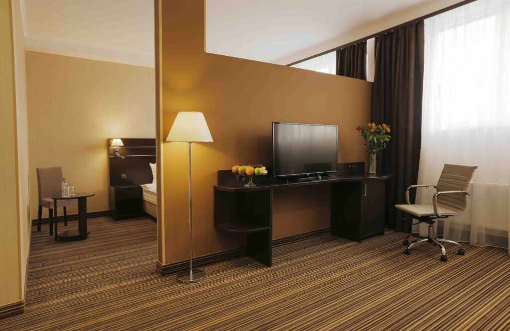 Просторный Джуниор Сьют с видом на парк с зонами для отдыха и работы площадью 29 м2 с системой электронного доступа. Большая кровать с ортопедическим матрасом. Мини-бар, кофейные и чайные принадлежности. Фен, халаты, тапочки и косметический набор для каждого гостя. Индивидуальный сейф. Бесплатный вайфай.