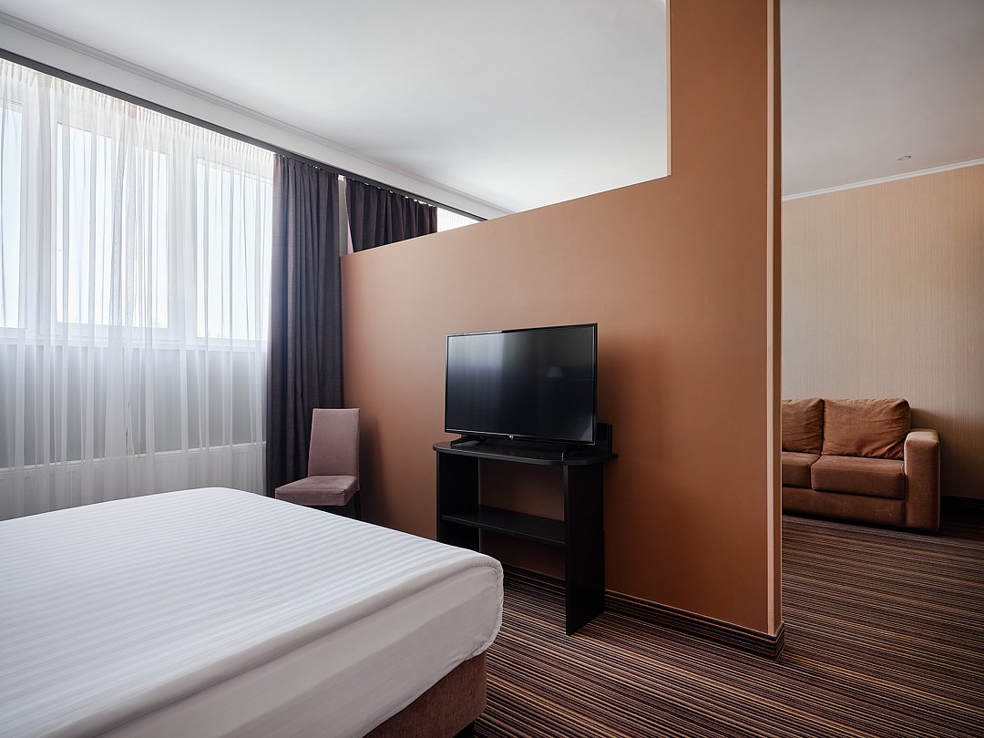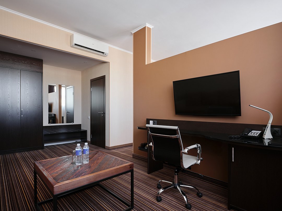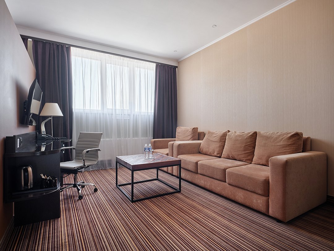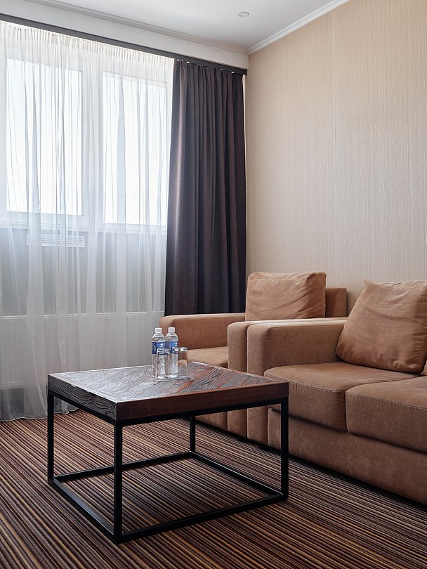 Двухкомнатный номер повышенной комфортности площадью 40м2 с системой электронного доступа. Имеет гостиную с мягким уголком и спальню с большой кроватью и ортопедическим матрасом. Оборудован эргономичной и функциональной мебелью, с использованием экологичных материалов и новейших технологий. Мини-бар, кофейные и чайные принадлежности. Фен, халаты, тапочки и косметический набор премиум класса для каждого гостя. Индивидуальный сейф. Бесплатный вайфай.