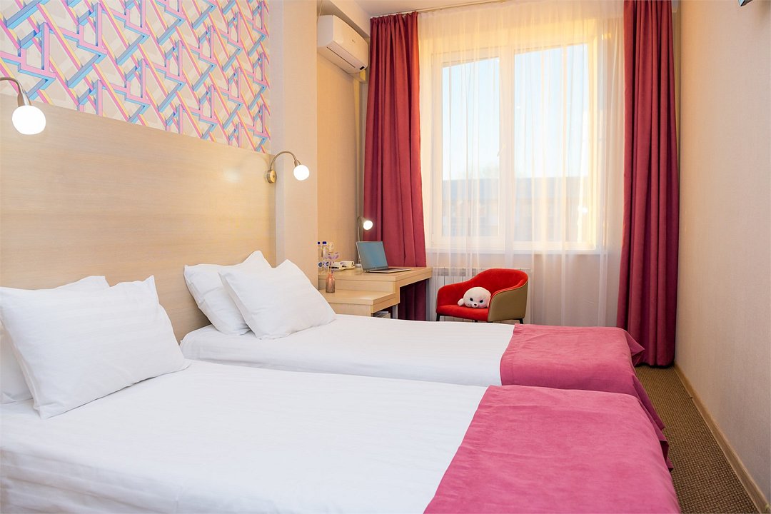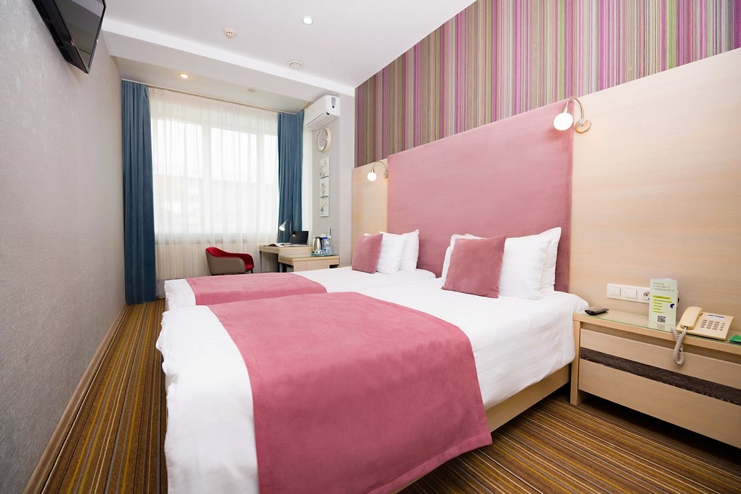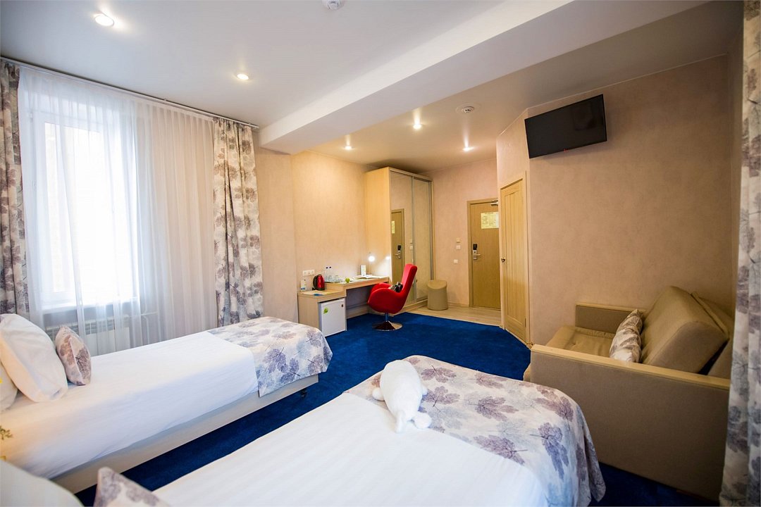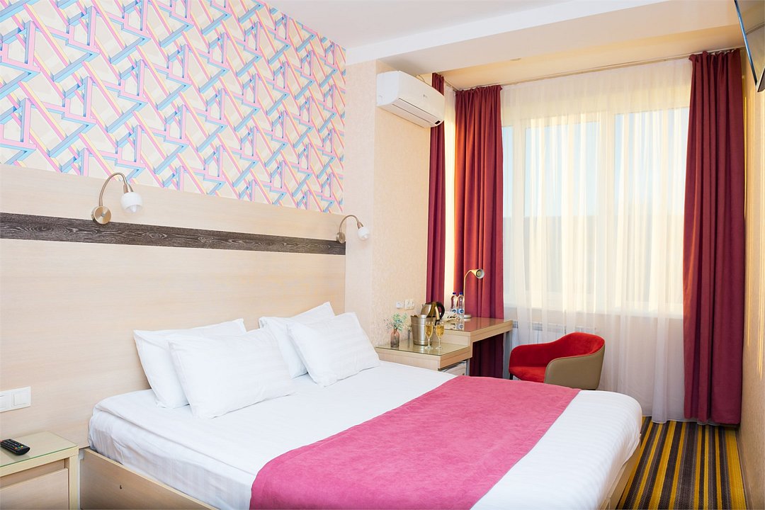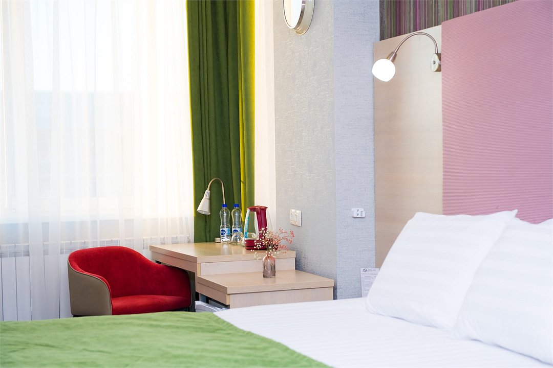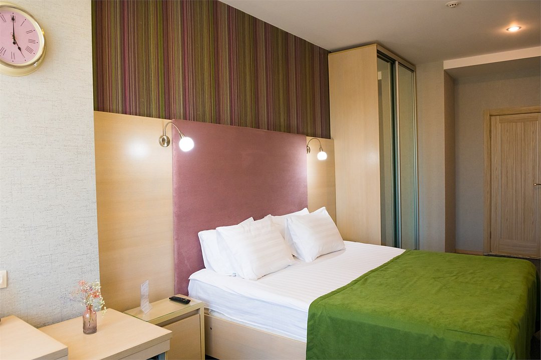 Номер категории "Комфорт" 22 кв.м. с просторной ванной комнатой. В номере присутствует самое необходимое для ночевки в отеле. Удобная мебель, двуспальная кровать, которую при желании можно раздвинуть на две односпальные кровати. Письменный стол, прикроватные тумбочки, шкаф, полка для багажа, пуф, стул, ТВ, телефон, холодильник, мини бар (за отдельную плату), сейф, бесплатный WiFi . Ванна, раковина, унитаз, зеркало, полотенца, фен, предметы индивидуального пользования, халат, тапочки. Чайник и чайные принадлежности, кофе, чай, бутилированная вода.Услуги и удобства