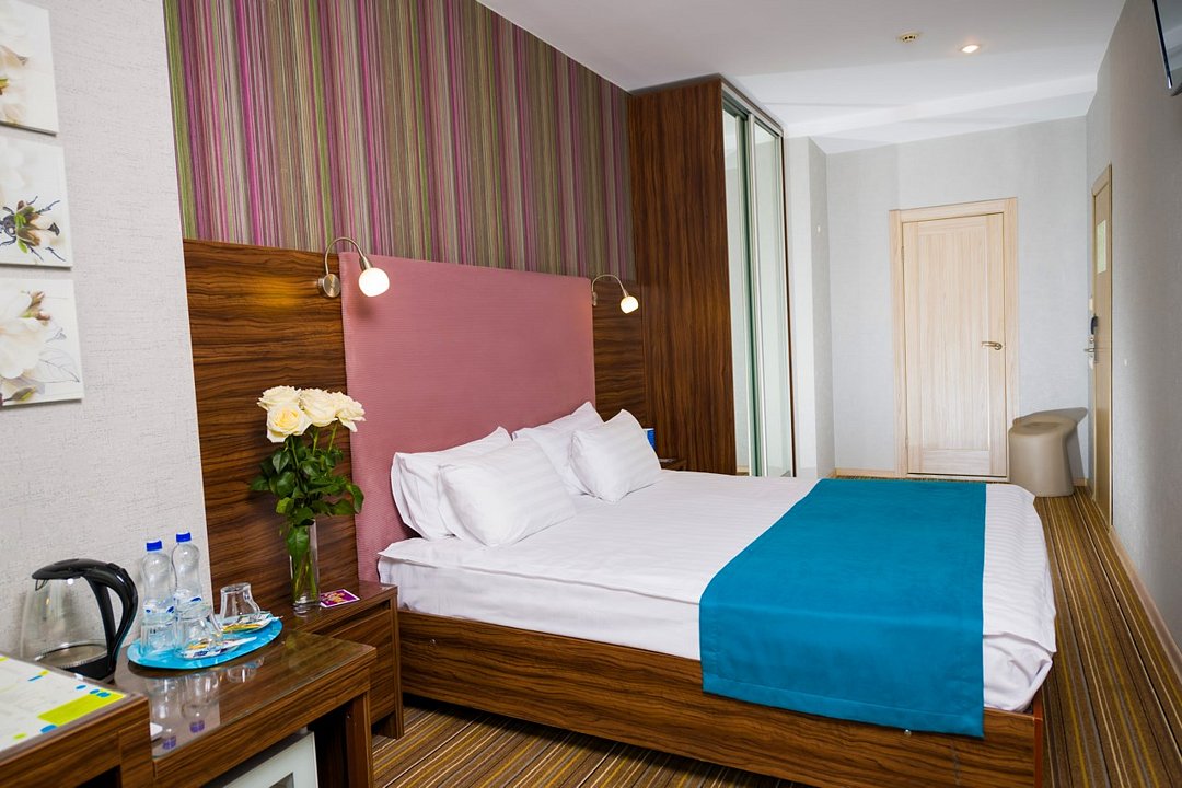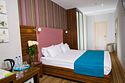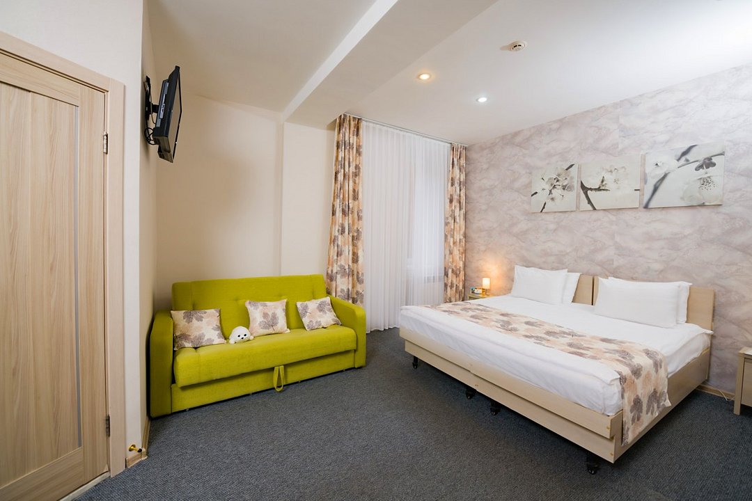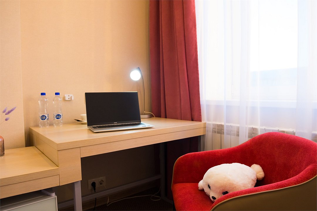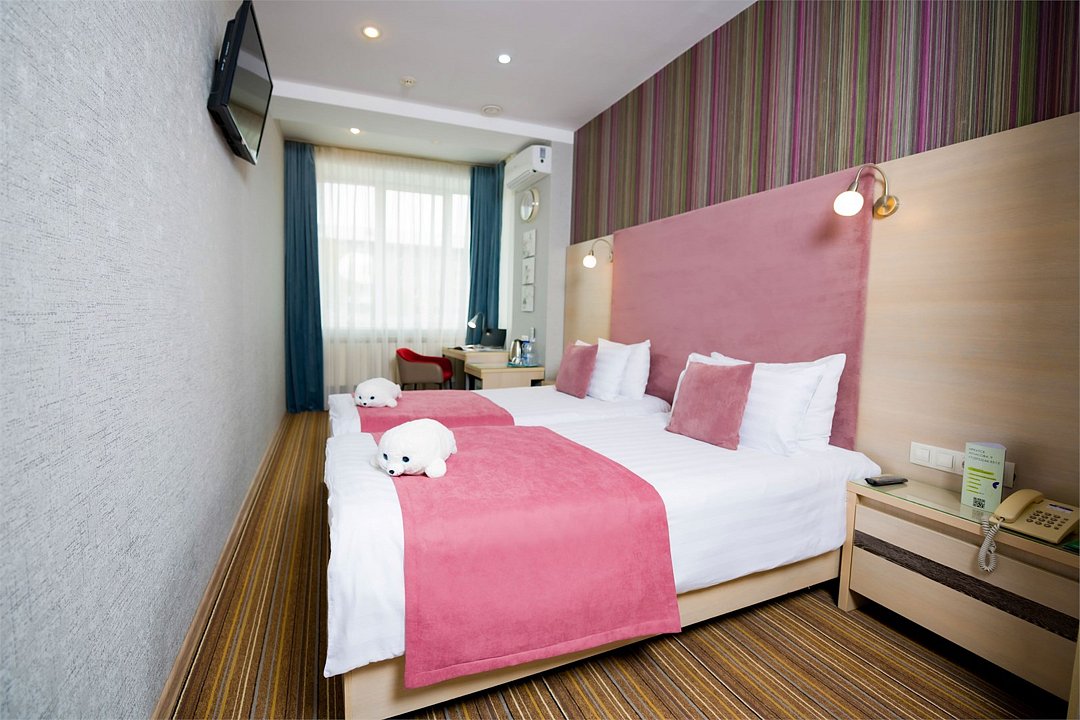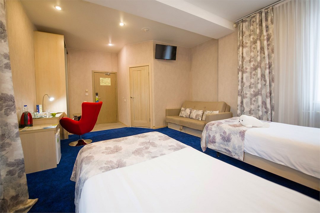 Номер категории "Комфорт" 22 кв.м. с просторной ванной комнатой. В номере присутствует самое необходимое для ночевки в отеле. Удобная мебель, двуспальная кровать, которую при желании можно раздвинуть на две односпальные кровати. Письменный стол, прикроватные тумбочки, шкаф, полка для багажа, пуф, стул, ТВ, телефон, холодильник, мини бар (за отдельную плату), сейф, бесплатный WiFi . Ванна, раковина, унитаз, зеркало, полотенца, фен, предметы индивидуального пользования, халат, тапочки. Чайник и чайные принадлежности, кофе, чай, бутилированная вода.Услуги и удобства