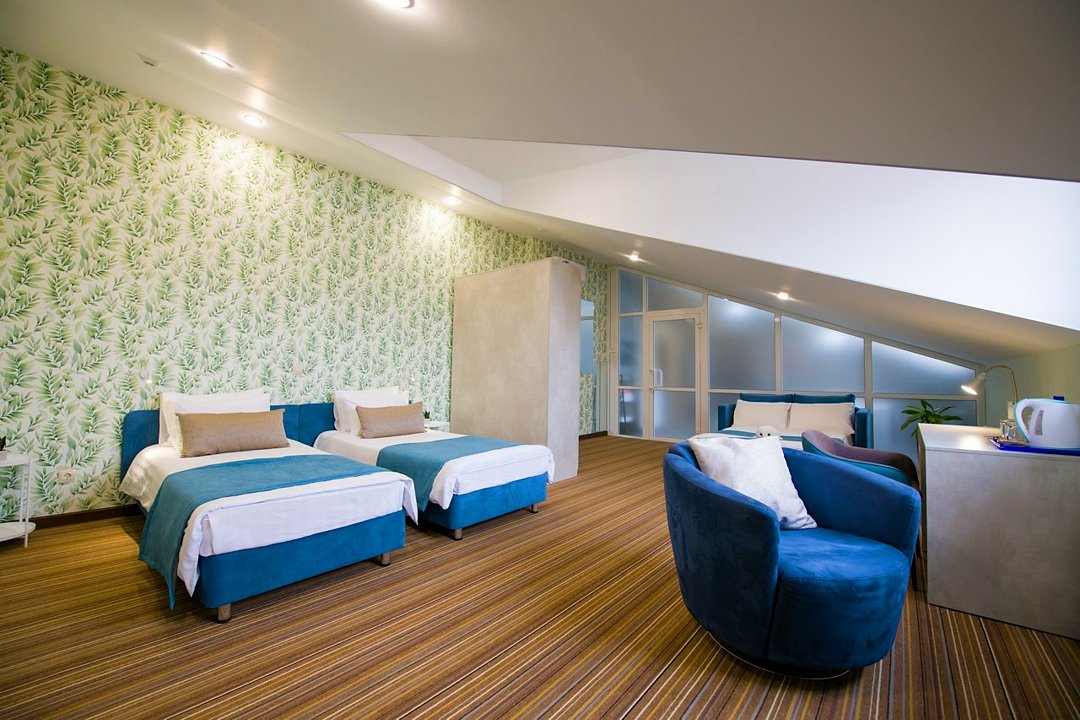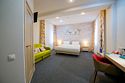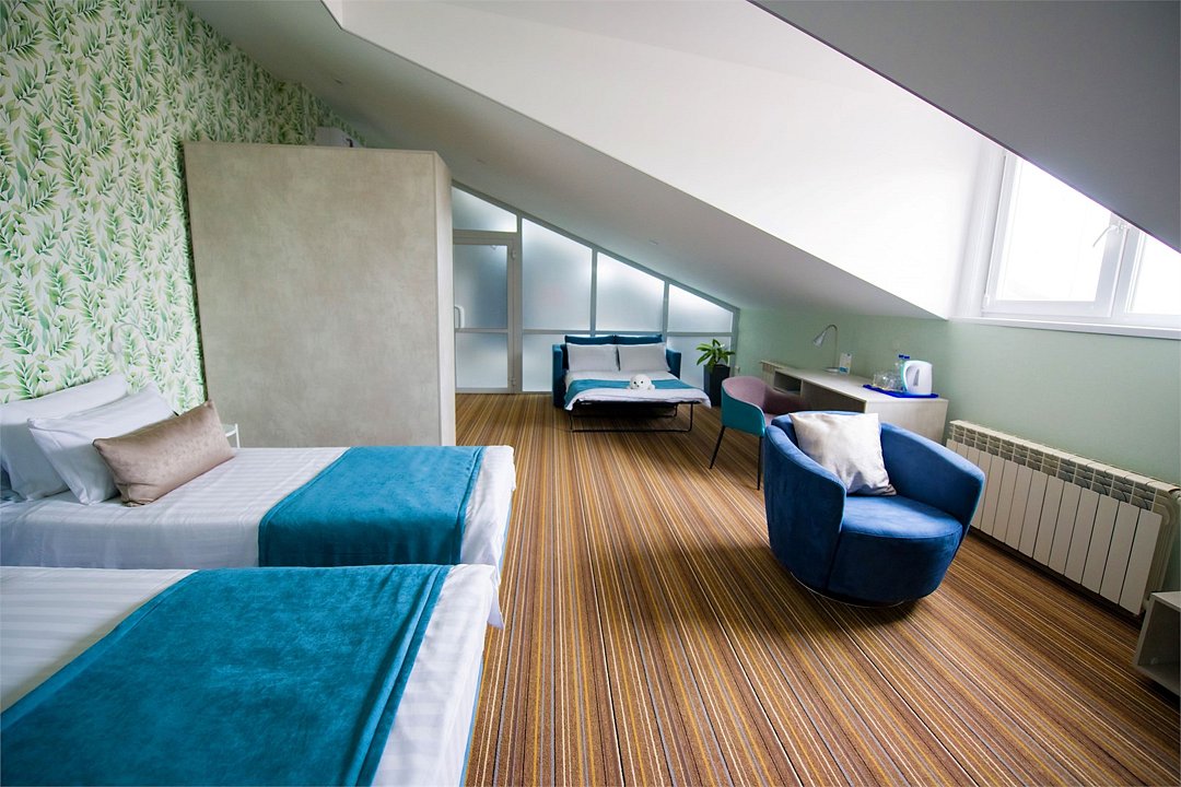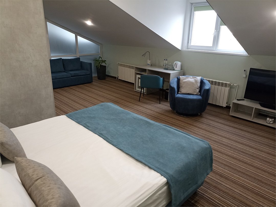 Джуниор сюит – двухместный мансардный номер с инфракрасной сауной. Прекрасный вариант для отдыха парой или компанией. Это не просто номер для проживания, это ваше уютное пристанище, где вы можете расслабиться и насладиться каждой минутой своего пребывания. Это место, где вы можете отдохнуть после долгого дня, проведенного в путешествии или на деловых встречах Номер выделяется своим уникальным сочетанием элегантности, простора и дополнительных удобств. . Это ваш личный оазис, где вы можете насладиться миром и тишиной, не отказываясь от удобств и комфорта. Прекрасное решение для гостей, путешествующих с детьми и для длительного проживания. Номер состоит из спальной и гостиной зоны, ванная комната с большой ванной и сауной. Общая площадь номера 43 кв.м. Расположен на верхнем 8м. этаже. Возможно предоставление двух дополнительных мест: раскладной диван и ламелевая раскладушка. Оснащение номера: две односпальные или одна двуспальная кровать, прикроватные тумбы, шкаф для одежды, кондиционер, холодильник, телевизор, электрочайник, фен. Оснащение санузла: душ и ванна, унитаз, раковина, полотенца (для лица, для ног, банное), халаты и тапочки, гигиенические средства. Просим Вас обратить внимание, что тип кроватей предоставляется в момент заселения. Вы можете указать свои пожелания по размещению при бронировании и мы по возможности их учтем.Услуги и удобства