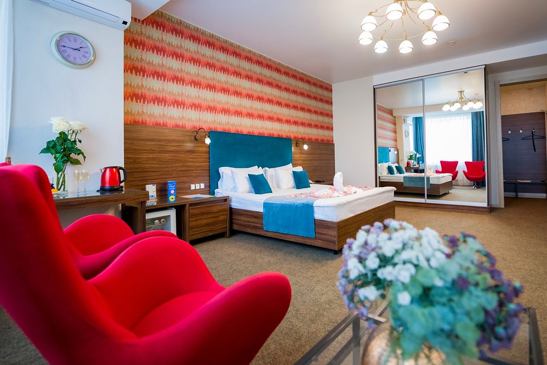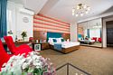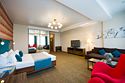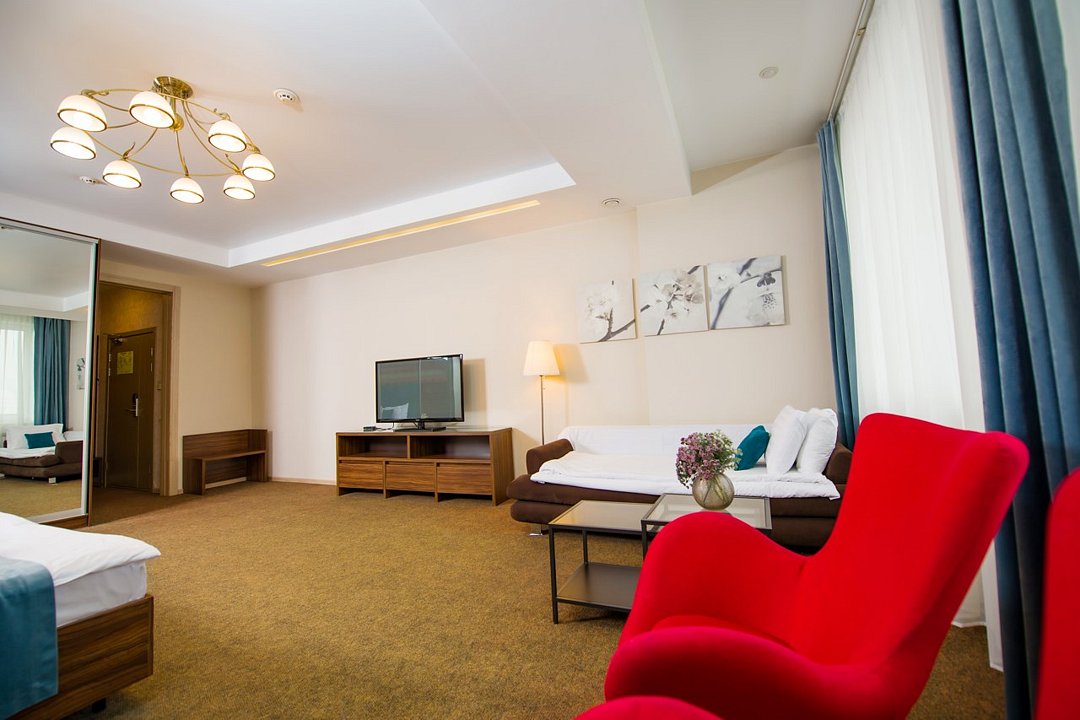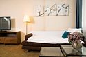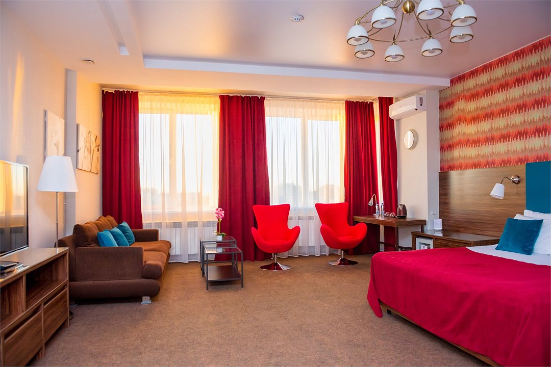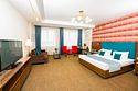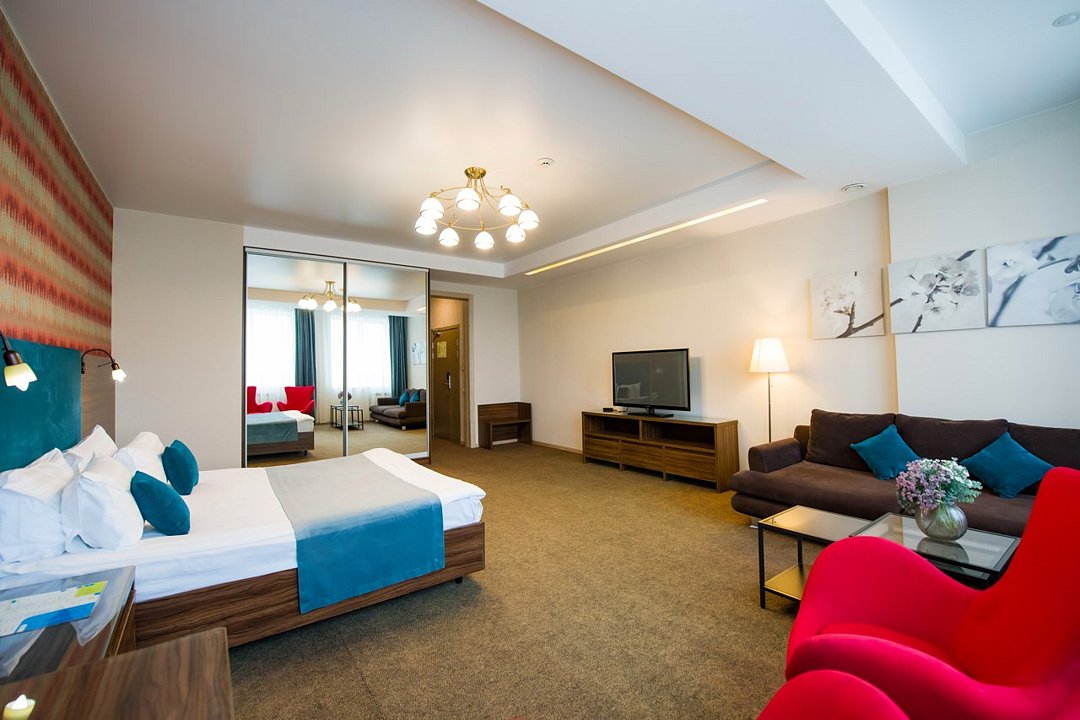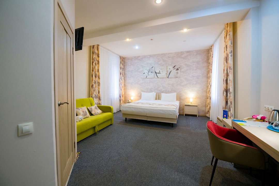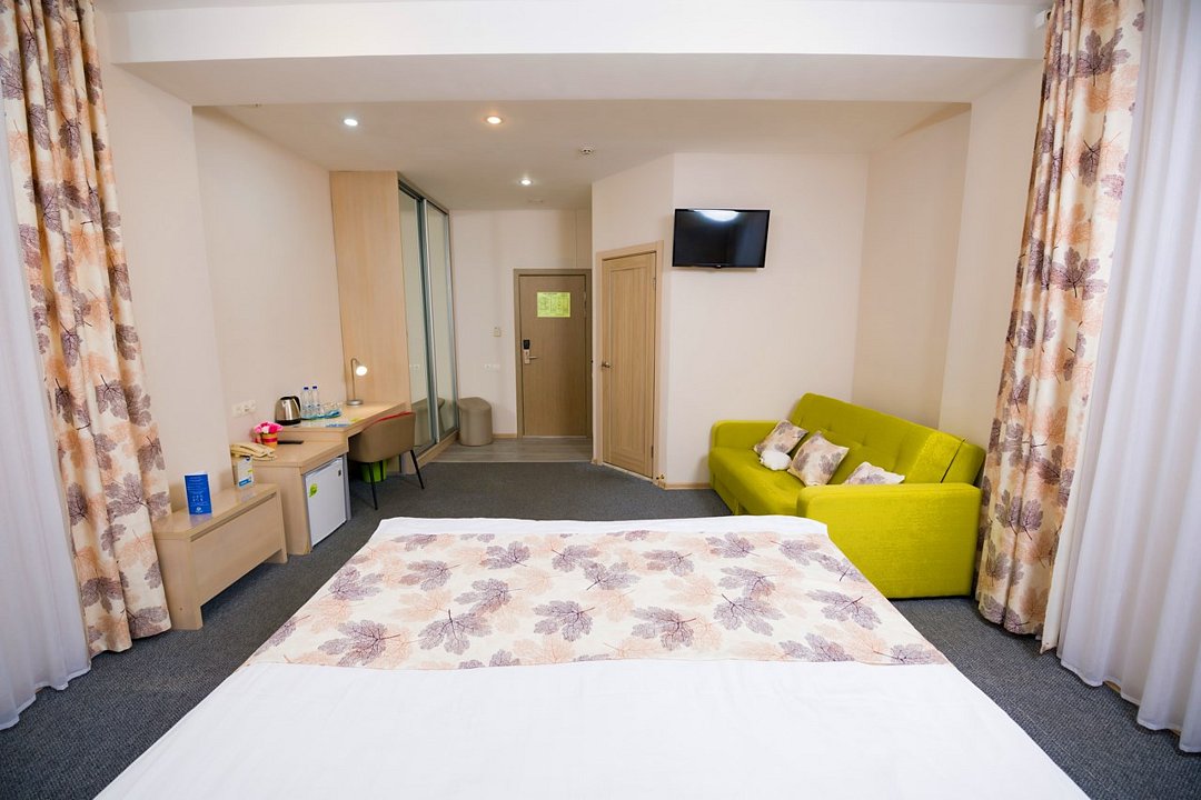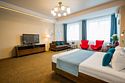 Один из лучших и комфортных номеров в нашем отеле, с большой гостевой зоной, большой двуспальной кроватью, раскладным диваном, удобными креслами и просторной ванной комнатой. Отличны вариант на длительное размещение во время командировки. Это пространство любят молодожены и семейные пары с детьми. Письменный стол, прикроватные тумбочки, шкаф, полка для багажа, журнальный столик, ТВ с большим экраном, телефон, холодильник, мини бар (за отдельную плату), сейф, бесплатный WiFi . Ванна, раковина, унитаз, зеркало, полотенца, фен, предметы индивидуального пользования, халат, тапочки. Чайник и чайные принадлежности, кофе, чай, бутилированная вода.Услуги и удобства