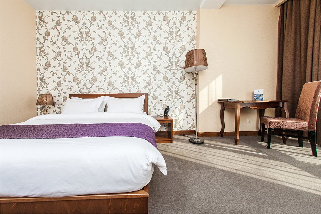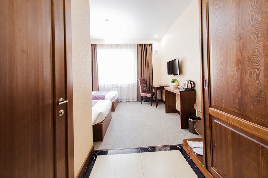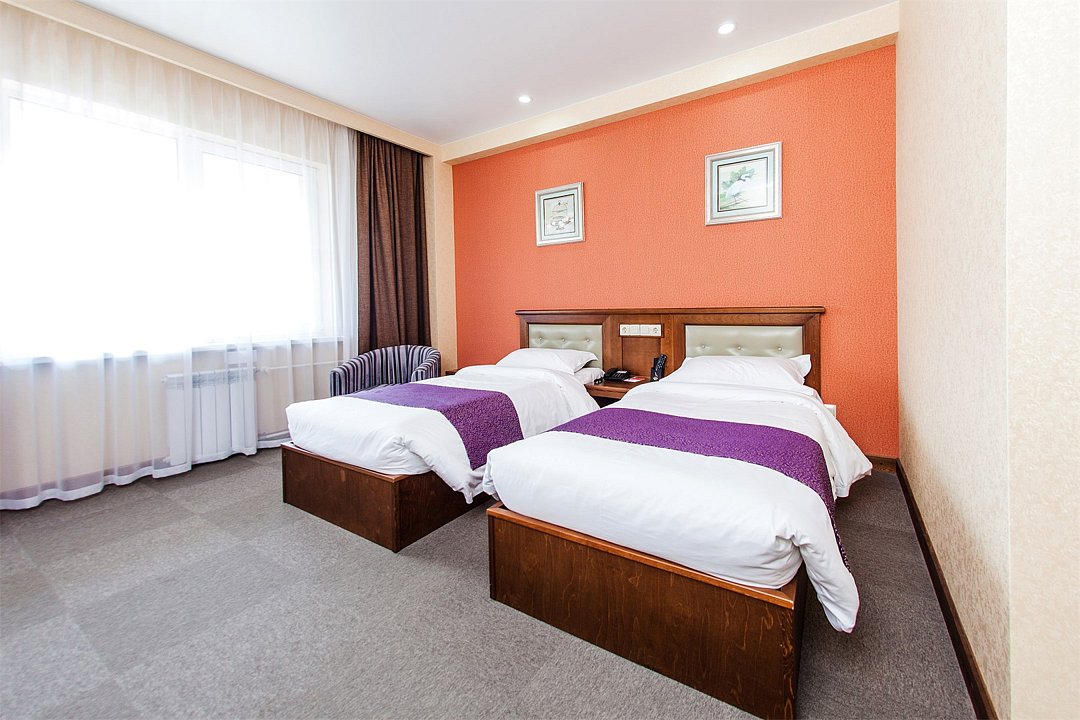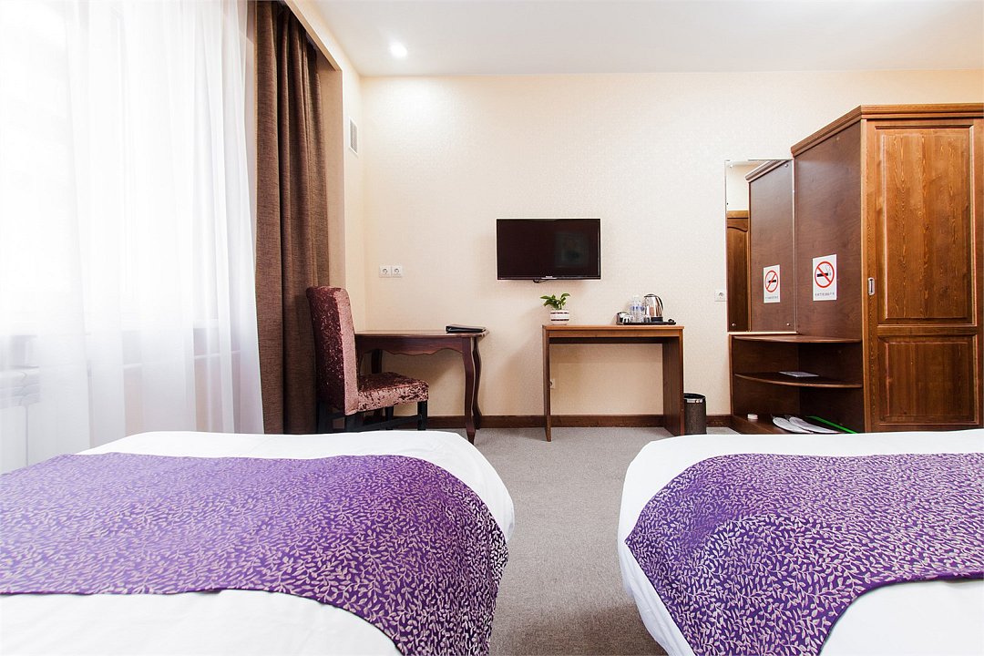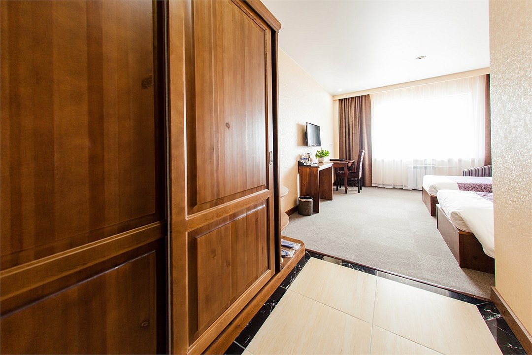 Уютный номер с видом на город. Площадь номера: 16 кв.м. Номер обставлен красивой удобной мебелью из натурального дерева и оснащен большой двуспальной, либо двумя раздельными кроватями, рабочим местом и мягким уголком.Услуги и удобства