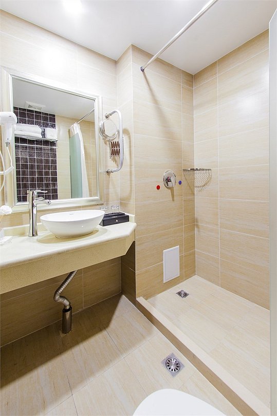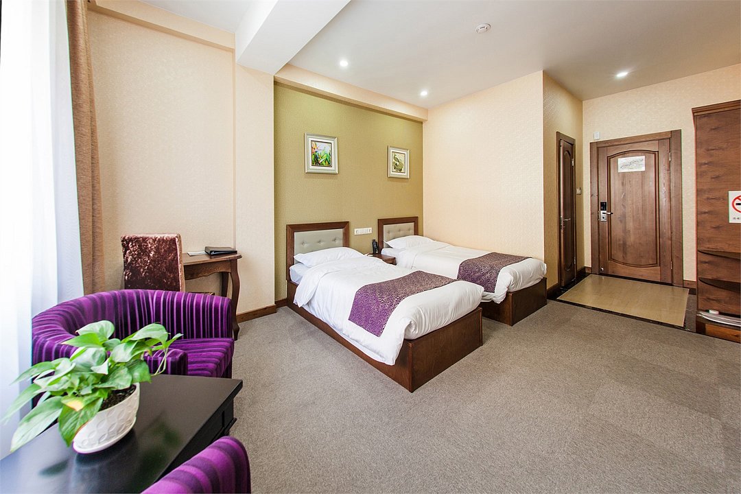 телевизор, кабельное телевидение, Wi-Fi, телефон, кондиционер, фен, электронные замки, санузел, банные принадлежности, банные полотенца, тапочки, косметические средства, балкон, две односпальные или большая двуспальная кровать, стулья, шкаф для одежды, вешалки, письменный стол, обслуживание номеров, чайник, косметическое зеркало, ковровое покрытие, отопление, китайский канал, вид во двор, номер для некурящих, чайная станция, уборка номера, услуги прачечной (платно), бутилированная вода, шапочка для душа, можно с питомцами, тропический душВ гостиничном номере
