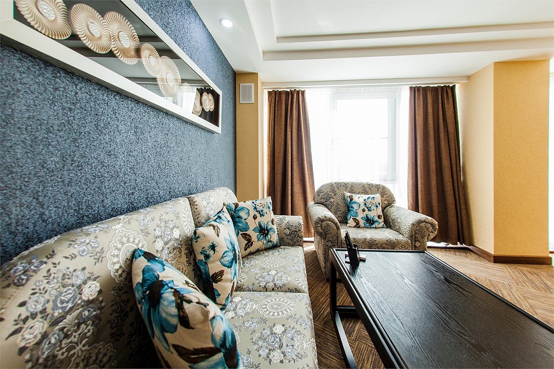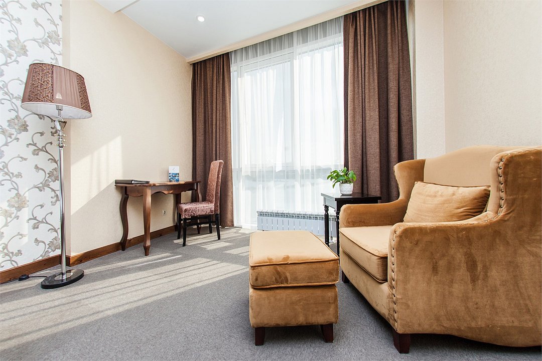Уютный номер с балконом, либо с выделенной зоной для отдыха с видом на город. Площадь номера: 20 кв.м. Номер обставлен красивой удобной мебелью из натурального дерева, большие окна пропускают много света. Подходит как для отдыха, так и для деловой поездки. *на фото представлен номер с выделенной зоной для отдыха.Услуги и удобства