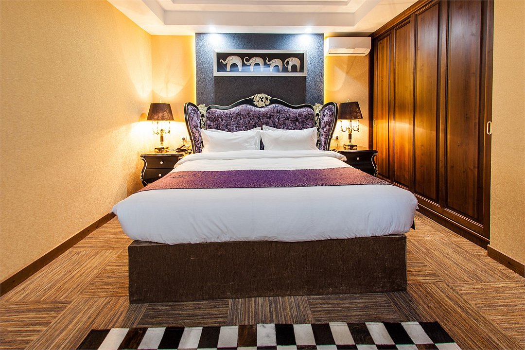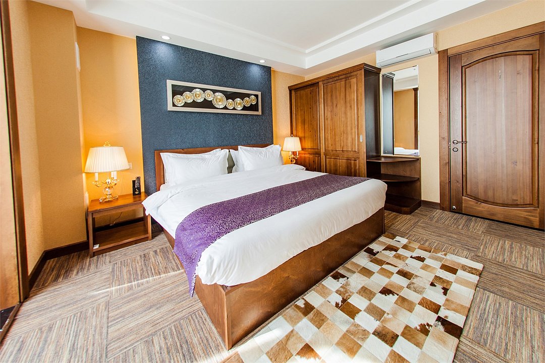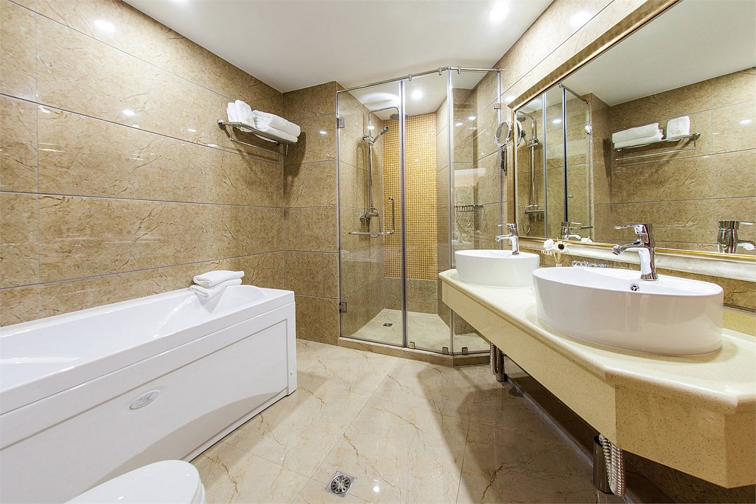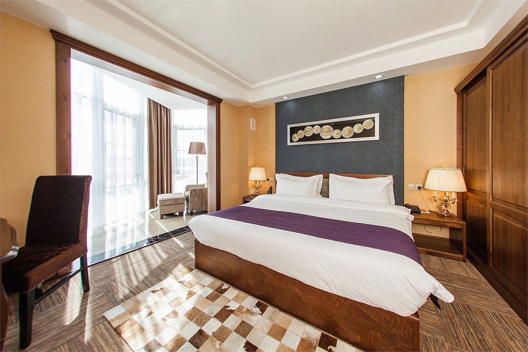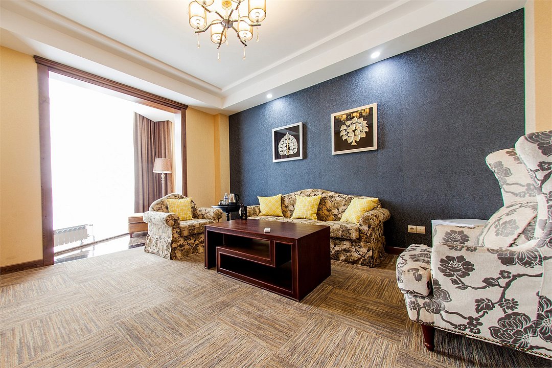 два телевизора, кабельное телевидение, Wi-Fi, телефон, кондиционер, фен, электронные замки, санузел, дополнительный санузел, банные принадлежности, халаты, банные полотенца, тапочки, косметические средства, кровать «King size», диван, стулья, шкаф для одежды, письменный стол, две комнаты, чайник, гостиная зона, ковровое покрытие, отопление, китайский канал, вид во двор, раскладное кресло, номер для некурящих, холодильный шкаф, чайная станция, уборка номера, услуги прачечной (платно), бутилированная вода, шапочка для душа, можно с питомцами, тропический душВ гостиничном номере