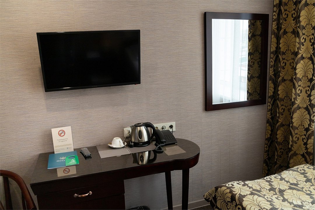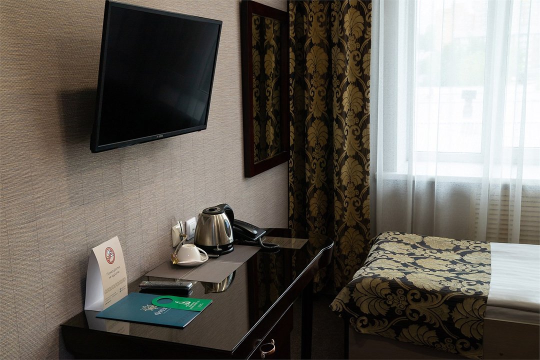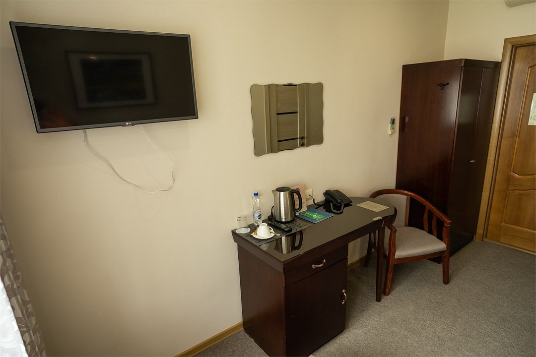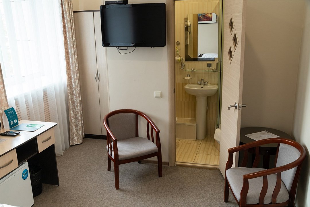 телевизор, Wi-Fi, телефон, настольные лампы, фен, утюг, банные принадлежности, банные полотенца, односпальная кровать, гипоаллергенное белье, гладильная доска, шкаф для одежды, вешалки, зеркало, мини-бар, обслуживание номеров, чайник, раковина, питьевая вода, душ, вид на город, кулер на этаже, кресло, стаканы, стол, тумба, туалетные средства, туалет, внутренний телефон, телевизор с плоским экраном, мини-холодильник, москитная сеткаВ номере