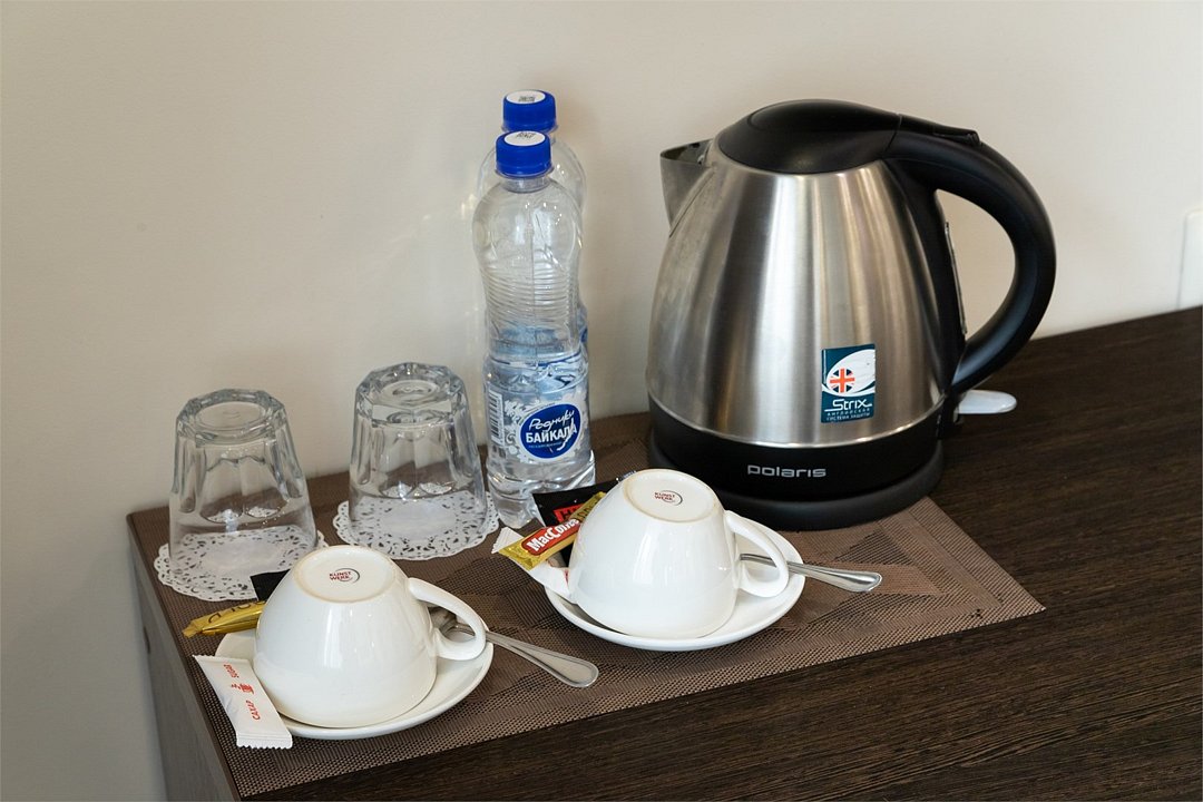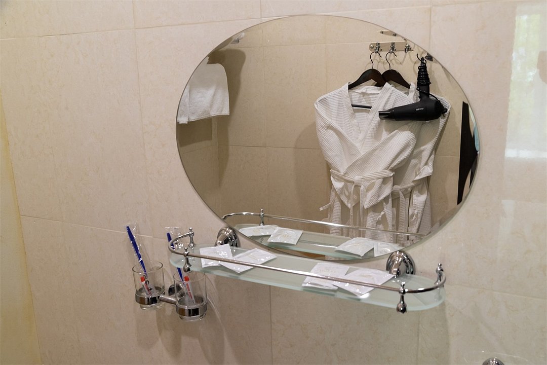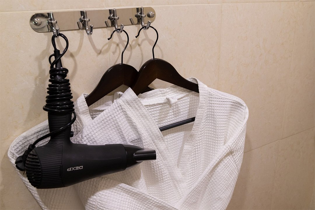 телевизор, кабельное телевидение, Wi-Fi, телефон, кондиционер, светильник, фен, утюг, банные принадлежности, халаты, банные полотенца, тапочки, кровать «King size», гипоаллергенное белье, гладильная доска, ортопедический матрас, тумбы, стулья, вешалки, журнальный столик, зеркало, мини-бар, чайный набор, обслуживание номеров, чайник, раковина, питьевая вода, ковровое покрытие, кулер на этаже, кресло, стаканы, стол, туалет, диван-кровать, раскладной диван, внутренний телефон, телевизор с плоским экраном, мини-холодильник, москитная сетка, шкаф-купеВ номере