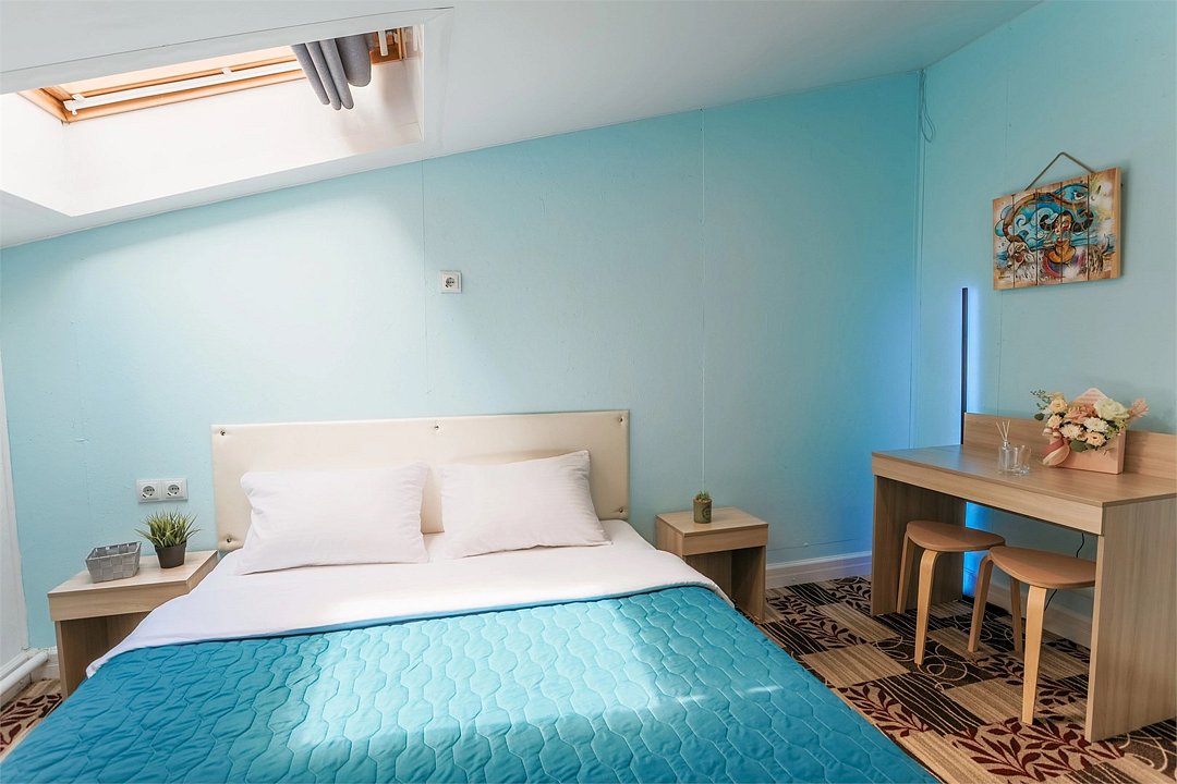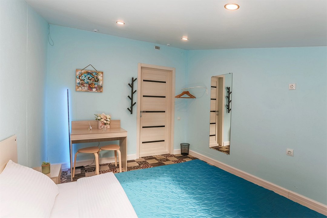 телевизор, кабельное телевидение, Wi-Fi, банные принадлежности, банные полотенца, двуспальная кровать, кулер на этаже, общая ванная комната, стул, санузел на этаже, мини-холодильник, телевизор со Smart TV, рабочий стол, мылоВ гостиничном номере