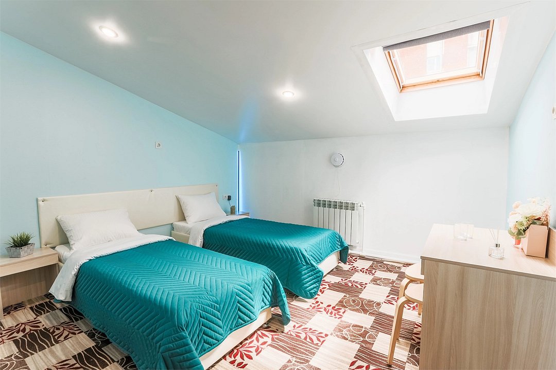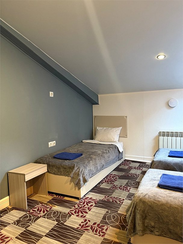 телевизор, Wi-Fi, светильник, банные полотенца, полутораспальная кровать, стулья, кулер на этаже, общая ванная комната, три полутораспальные кровати, стол, тумба, туалетные средства, санузел на этаже, мини-холодильник, телевизор со Smart TVВ гостиничном номере