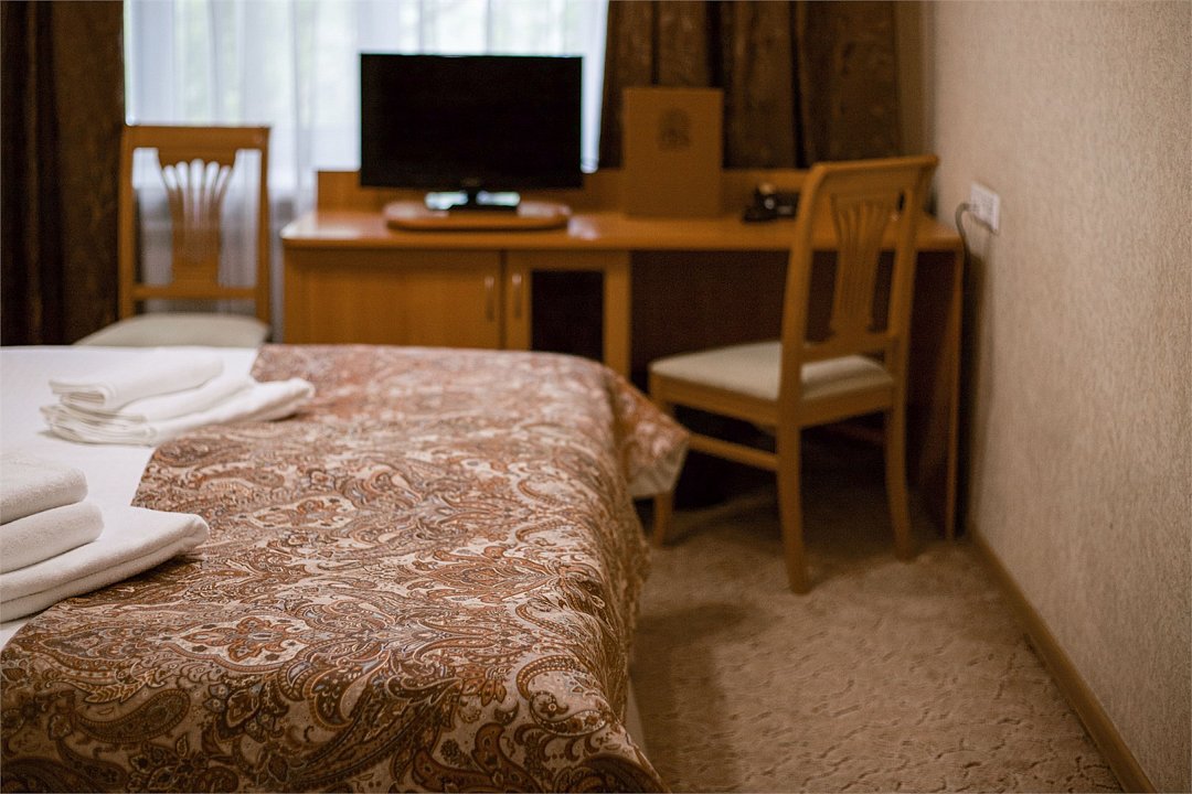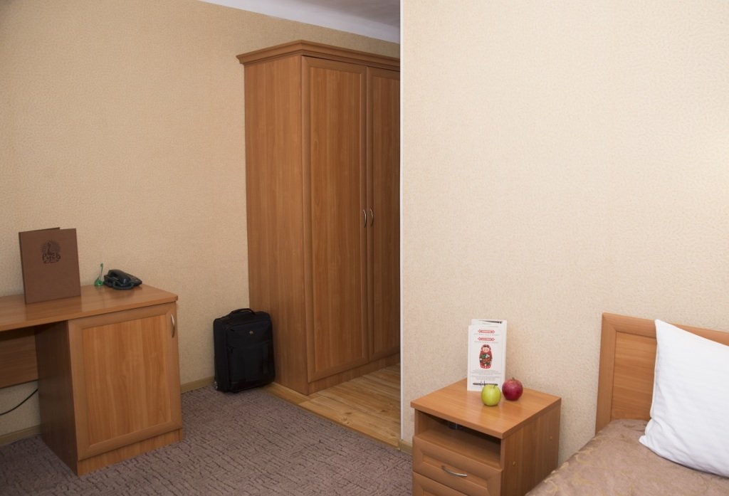 Одноместный стандартный номер площадью 12 кв.м. Вид из окна на исторический центр города либо во двор. В номере имеются: ванная комната (с ванной либо душевой кабиной, туалетом); фен, набор полотенец, зеркало, одноразовые банные принадлежности (гель для душа, шампунь, мыло); холодильник; чайник письменный стол, стул; кровать (120*200); шкаф, подбагажник; зеркало; внутренний телефон; телевизор с плоским экраном, кабельное телевидение.Услуги и удобства