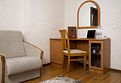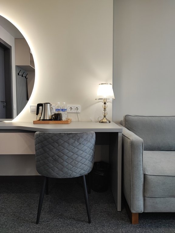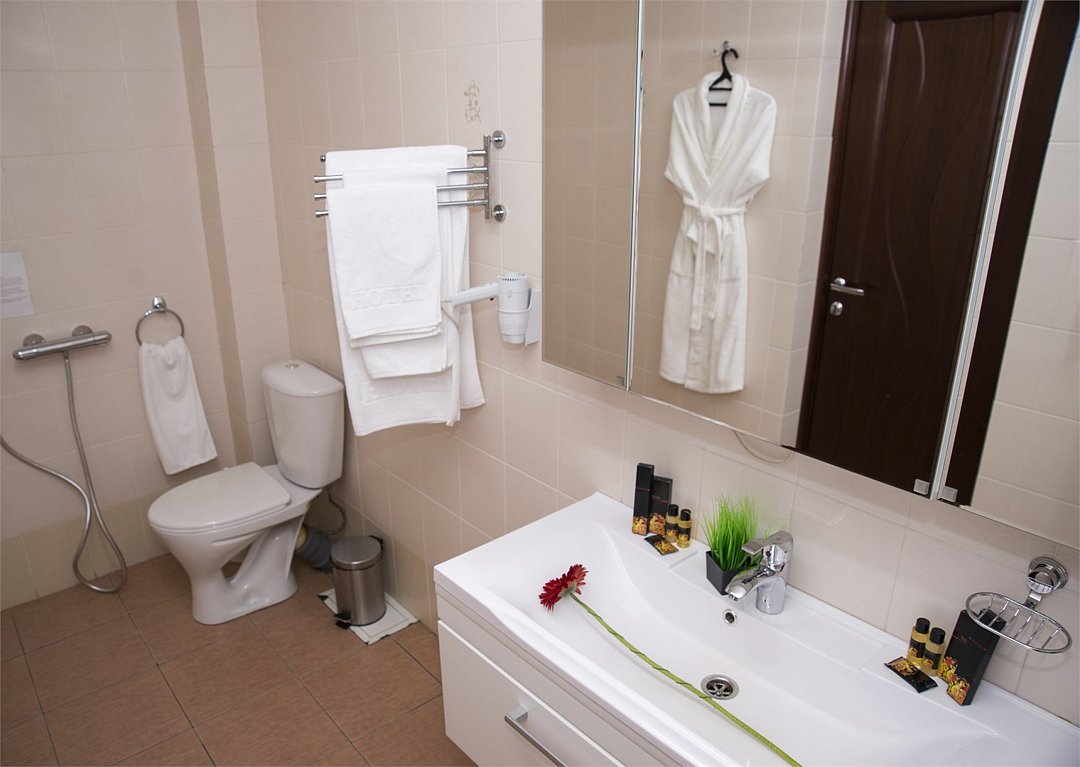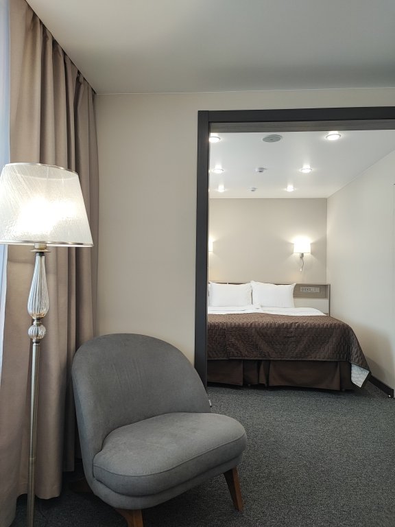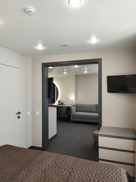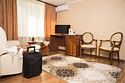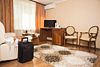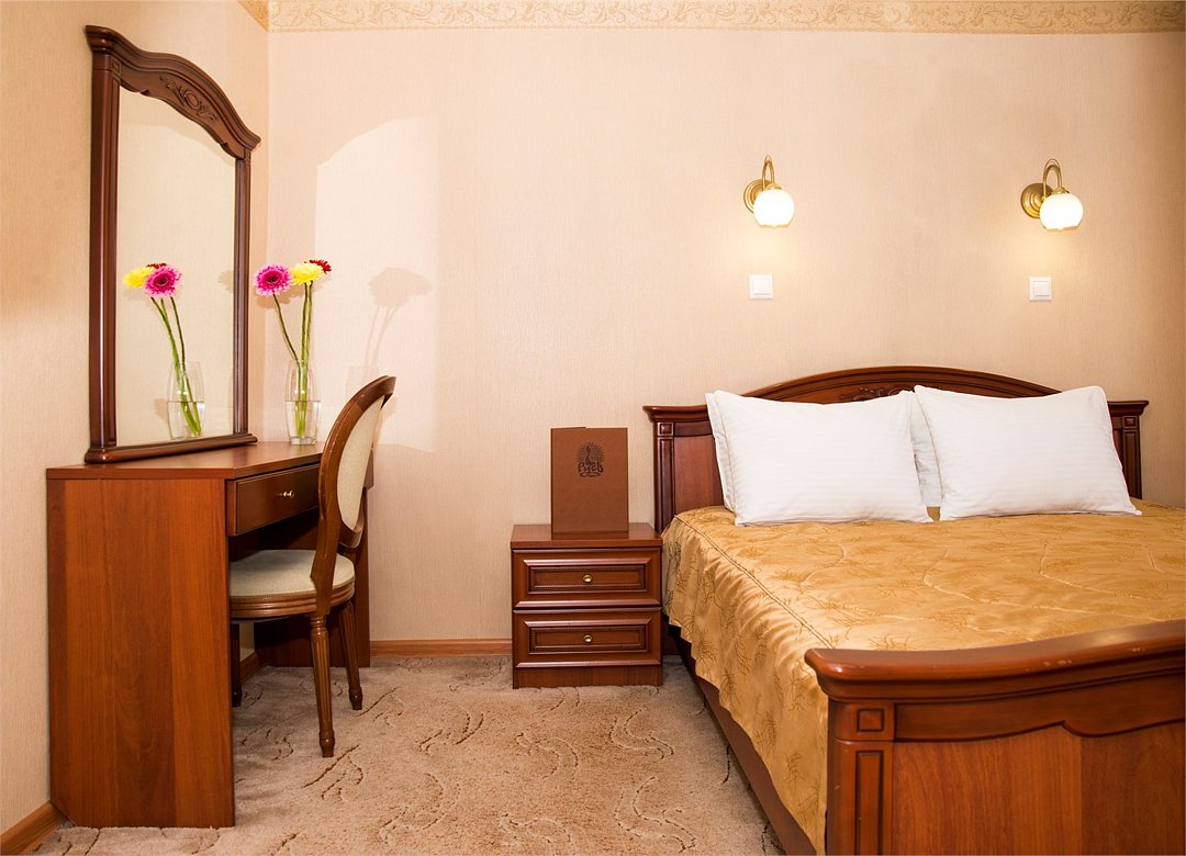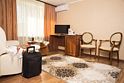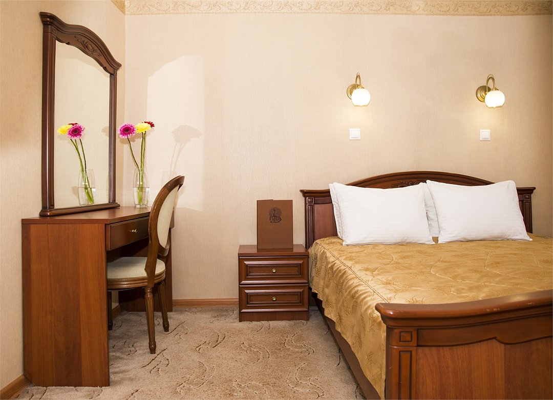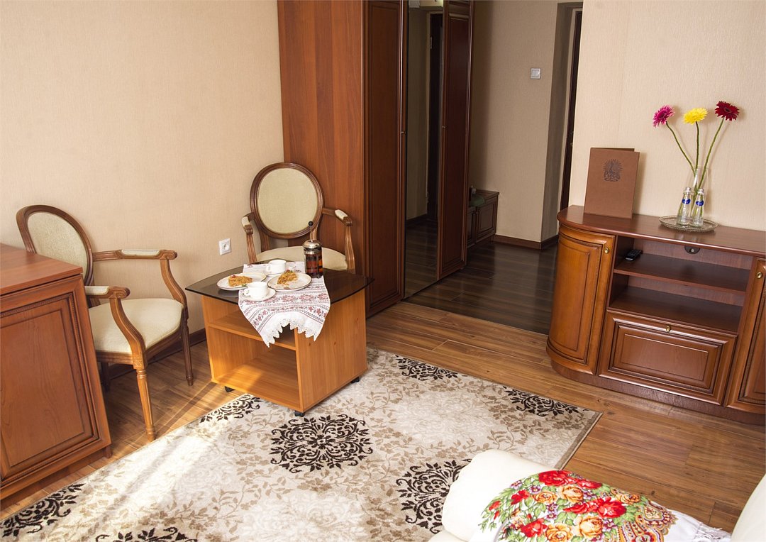 Двухкомнатный комфортабельный номер с гостиной и спальней. Элегантный декор, двуспальная кровать, большие комнаты. Площадь помещения – 30 кв.м. Вид из окна на исторический центр города. Возможно одноместное и двухместное размещение. В номере: двуспальная кровать (160*200); туалетный столик, письменный стол; чайная станция; внутренний телефон; платяной шкаф, подбагажник; холодильник; телевизор с плоским экраном, кабельное телевидение; ванная комната с душевой кабиной либо ванной, туалетом; фен, набор полотенец, банные халаты, одноразовые банные принадлежности (гель для душа, шампунь, мыло, шапочка для душа, зубная паста, зубная щетка, бритвенный набор)Услуги и удобства