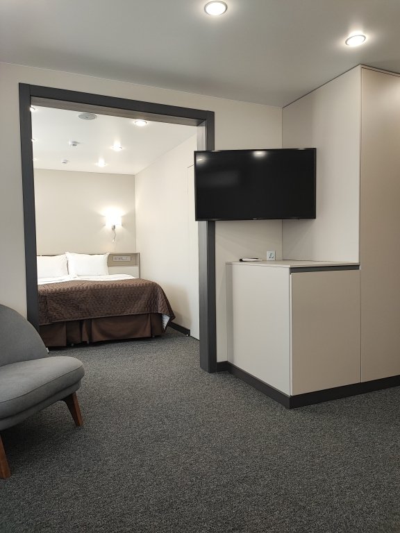 Двухкомнатный комфортабельный номер с гостиной и спальней. Элегантный декор, двуспальная кровать, большие комнаты. Вид из окна во внутренний дворик. Возможно одноместное и двухместное размещение. В номере: двуспальная кровать (180*200); письменный стол; чайная станция телефон; платяной шкаф, подбагажник; холодильник; два телевизора с плоским экраном, кабельное телевидение; ванная комната с душевой зоной, туалетом; фен, набор полотенец, банные халаты, одноразовые банные принадлежности (гель для душа, шампунь, мыло, шапочка для душа, зубная паста, зубная щетка, бритвенный набор)Услуги и удобства
