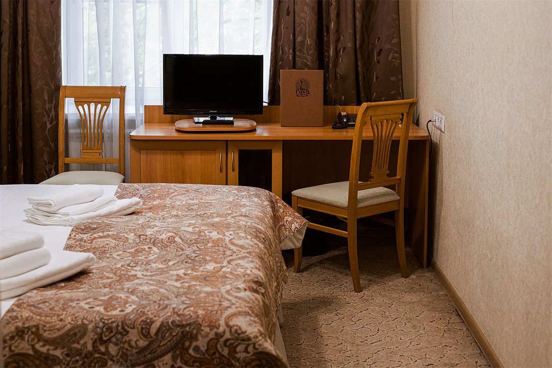 Удобный двухместный номер площадью 15 кв.м. с двумя раздельными кроватями. Возможно размещение одного или двух человек. Особенно востребован во время проведения деловых мероприятий (конференций, семинаров). Вид из окна на исторический центр города либо во двор. В номере: ванна, туалет; фен, набор полотенец, одноразовые банные принадлежности (гель для душа, шампунь, мыло). телефон, телевизор с плоским экраном, кабельное телевидение холодильник, чайник 2 односпальные кровати (90х200), или 1 двуспальная кровать (180*200), встроенный шкаф, подбагажник, письменный стол, стул зеркалоУслуги и удобства