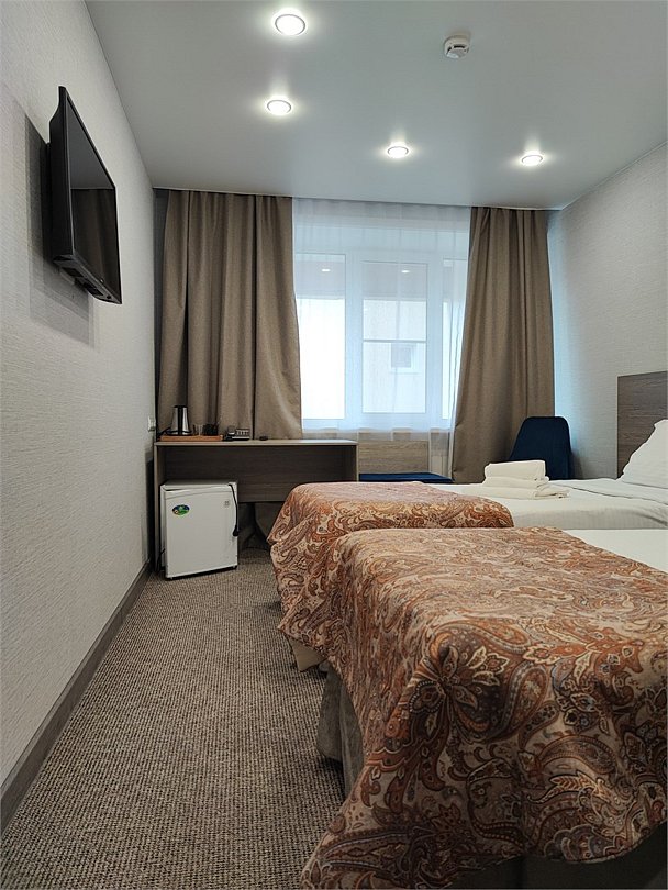 кабельное телевидение, Wi-Fi, светильник, фен, ванная комната, ванна, санузел, банные полотенца, две односпальные или большая двуспальная кровать, стулья, вешалки, письменный стол, багажная тумба, зеркало, унитаз, раковина, отопление, вид на город, кулер на этаже, вид во двор, стаканы, туалетные средства, внутренний телефон, телевизор с плоским экраном, мини-холодильник, москитная сетка, шкаф-купе, номер для некурящих, чайная станция, уборка номера, мыло, можно с питомцамиВ гостиничном номере