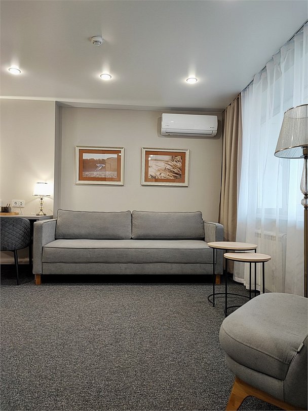 Комфортабельный двухкомнатный номер с элегантно декорированной гостиной и спальней. Возможно одноместное и двухместное размещение. Площадь номера – 30 кв.м. Вид из окна на исторический центр города либо во двор. В номере: холодильник; чайник 2 односпальные кровати (90х200) или 1 двуспальная кровать (180*200); платяной шкаф, подбагажник; письменный стол, стул; мягкая мебель в гостиной (кресло, диван); телефон; телевизор с плоским экраном, кабельное телевидение; ванная с душевой кабиной, туалет; фен, набор полотенец, зеркало, банные принадлежности;Услуги и удобства