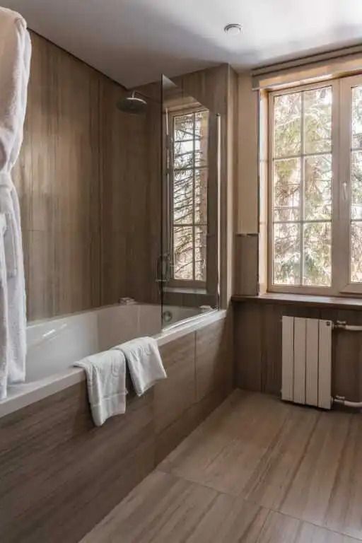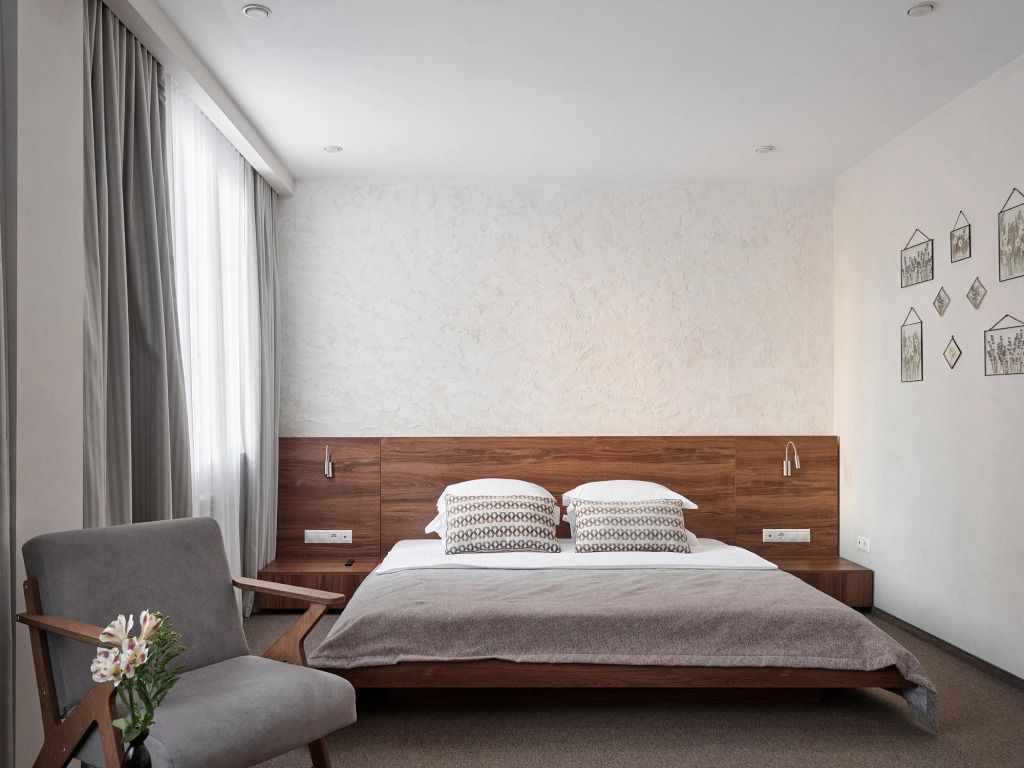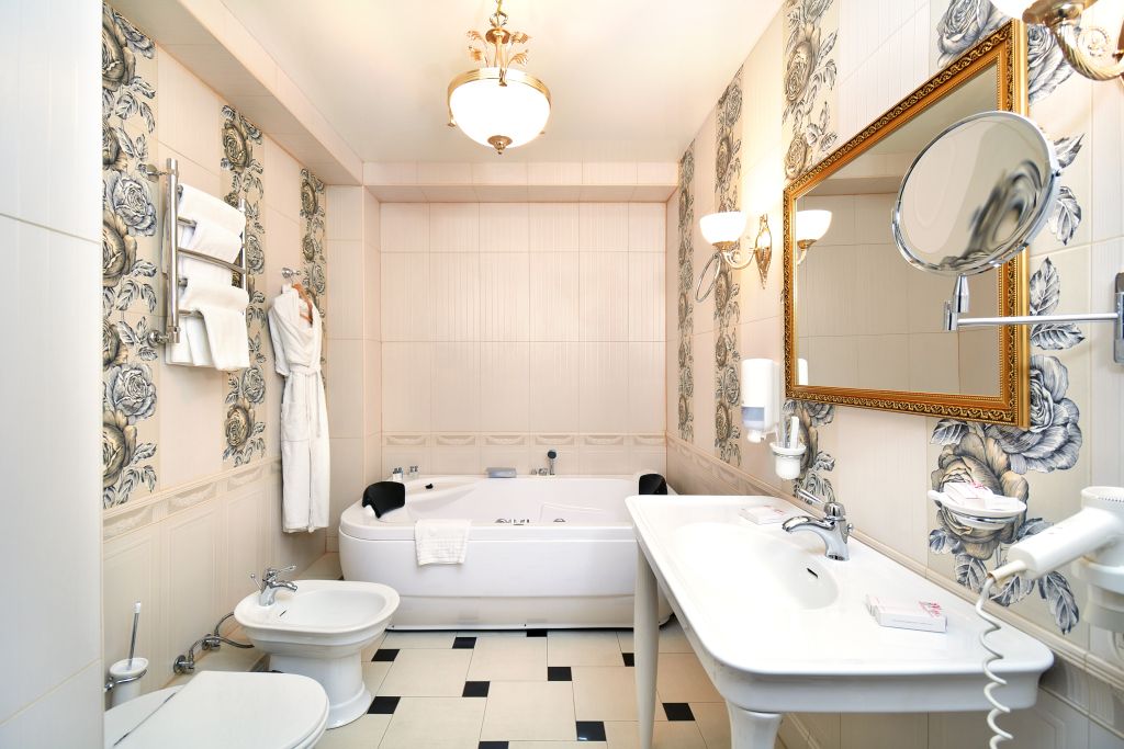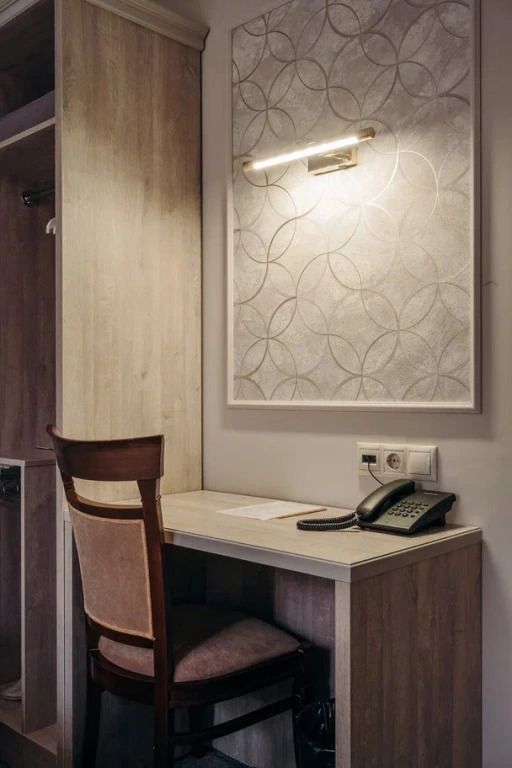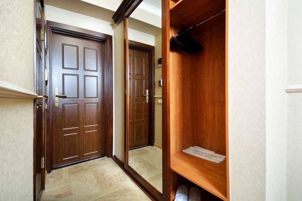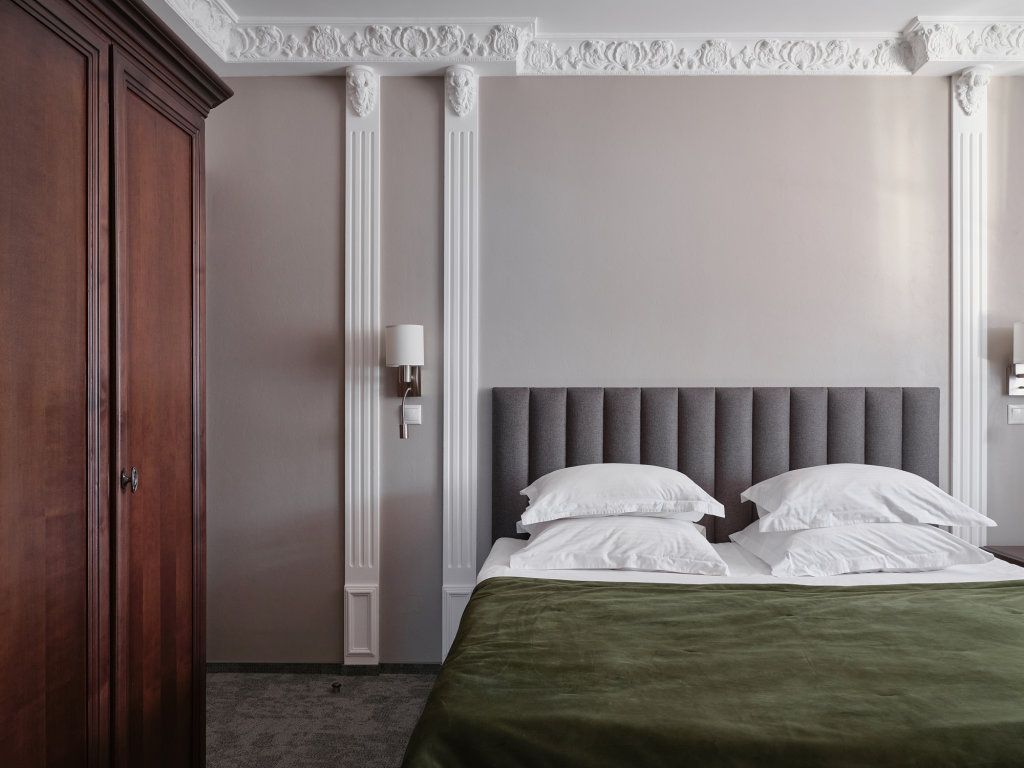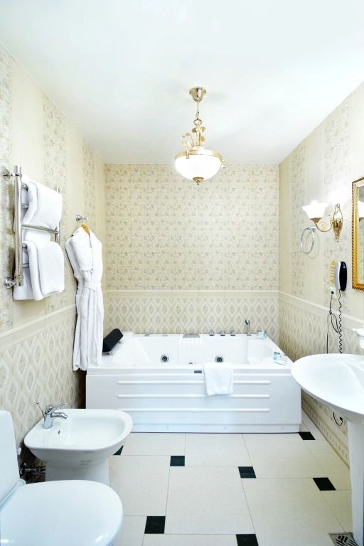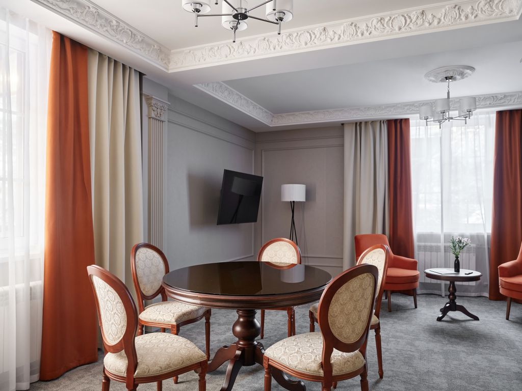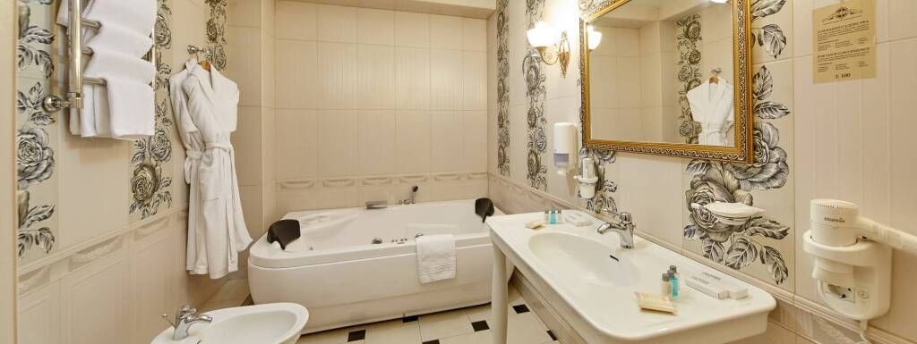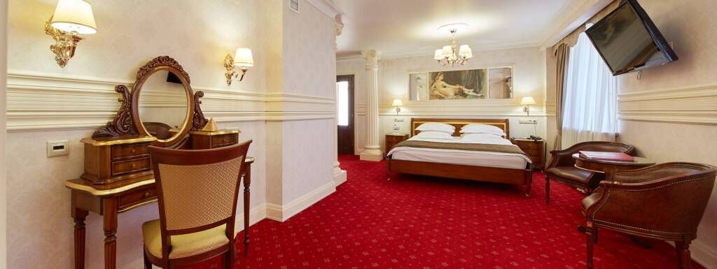 Интерьер номера выполнен в классическом стиле с использованием двух вариаций отделки - «мужской» и «женской». Вас порадует авторский дизайн, современная техника и отличная мебель из массива дерева.