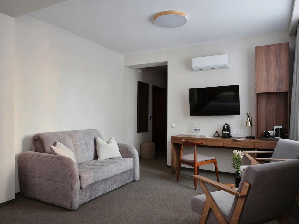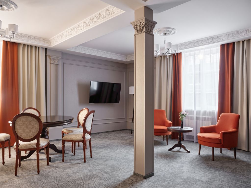 Номер «Джуниор сьют» - это соединение классической элегантности и современной классики. Просторный номер предлагает большую удобную кровать, прекрасные постельные принадлежности, оборудованное рабочее место, комфортную зону отдыха с уютным диваном. Ванная комната имеет окно с естественным освещением, оснащена ванной и биде.