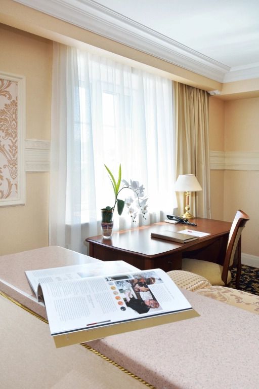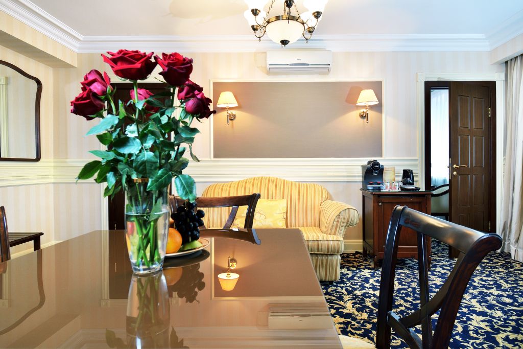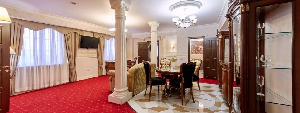 Просторный трехкомнатный «Президентский люкс» площадью 100 кв. метров позволит гостям ощутить исключительный комфорт в элегантной атмосфере роскоши. Интерьер номера оформлен в стиле французского барокко, классическом стиле с элементами лепнины и колоннами, а также с использованием дизайнерских фресок, произведенных по секретной технологии в Москве. В распоряжении гостей функциональная гостиная, уютным диваном и большим обеденным столом. Две роскошные спальни, каждая из которых оснащена ванной комнатой, приглашают ко сну и отдыху на больших комфортных кроватях с прекрасными постельными принадлежностями. С лоджии, прилегающей к одной из спален, открывается великолепный вид на город. Ванные комнаты оснащены джакузи, биде, полом с подогревом.