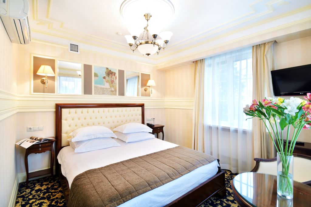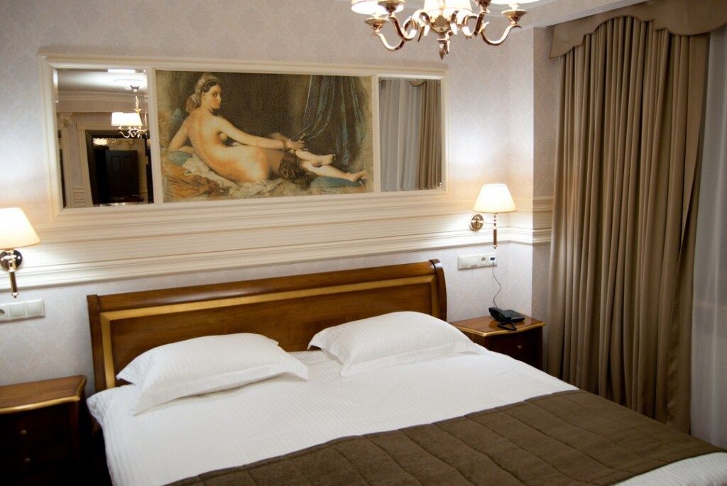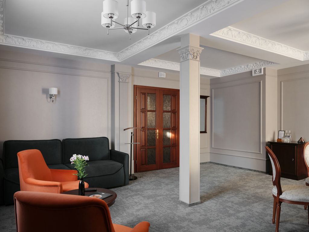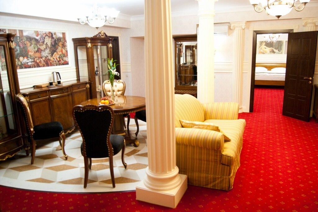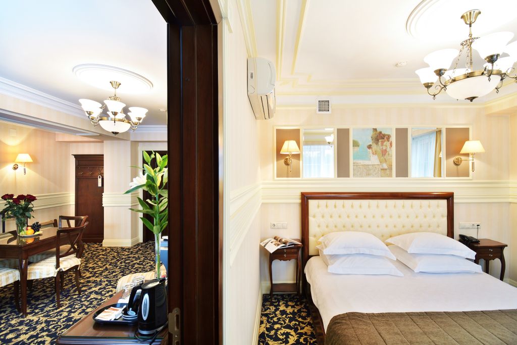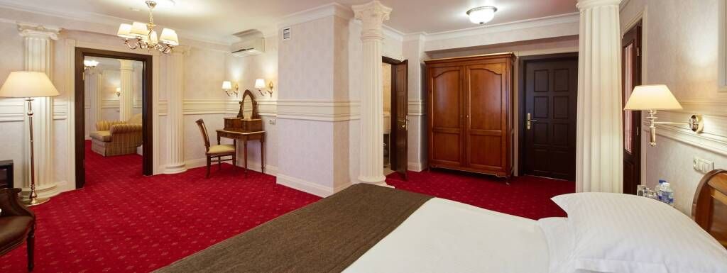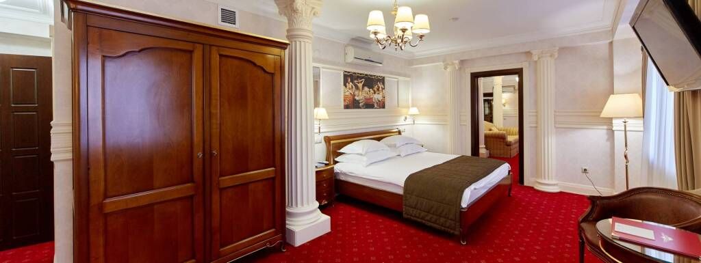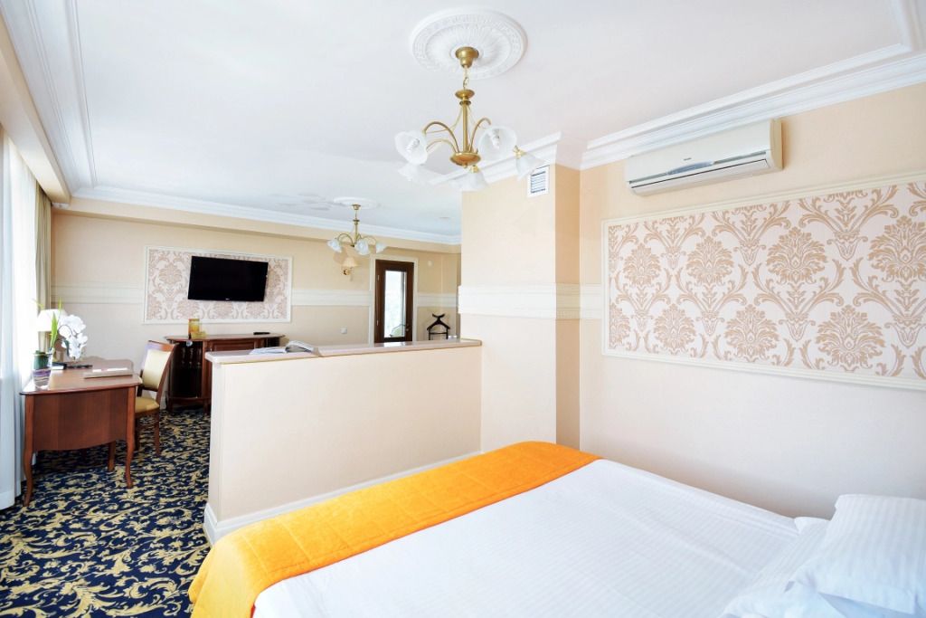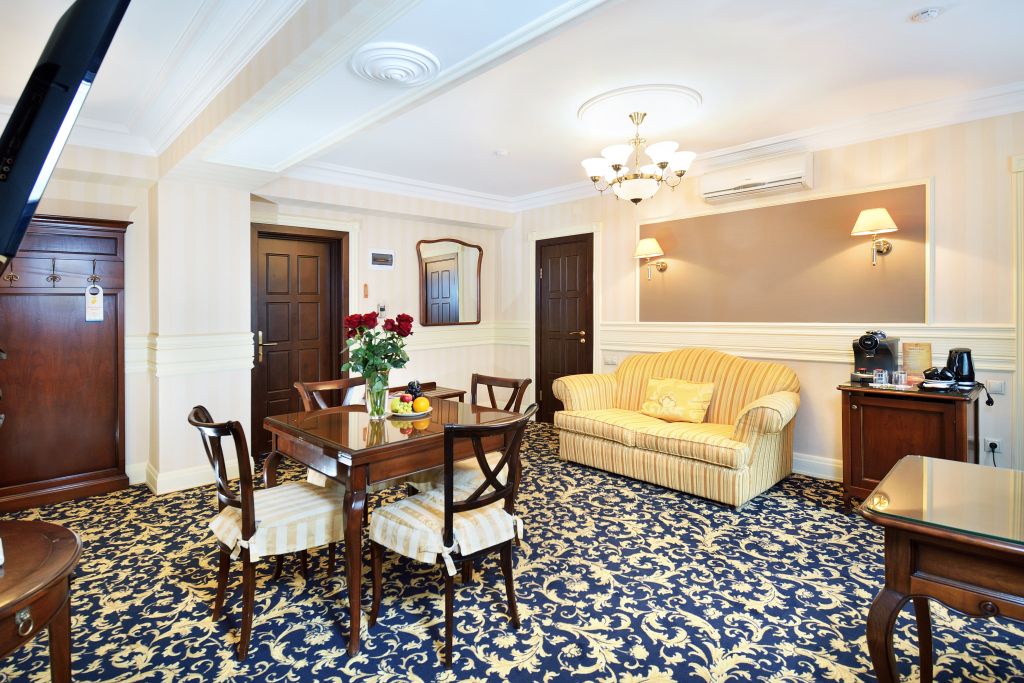 Классический интерьер двухкомнатных номеров категории «Люкс» приглашает прикоснуться к современной роскоши. Стильная мебель и декоративные предметы интерьера создают неповторимую атмосферу в сочетании с лепными колоннами, масляной живописью, зеркалами. Один из люксов имеет собственную террасу, с которой открывается вид на внутренний дворик отеля. В распоряжении гостей прекрасная двуспальная кровать с комфортными постельными принадлежностями, оборудованное рабочее место, круглый обеденный стол, уютный диван и кресла, современное техническое оснащение, индивидуальная система кондиционирования, LCD-телевизоры, бесплатный wi-fi. Ванная комната оснащена джакузи, душевой кабиной, биде, полом с подогревом.