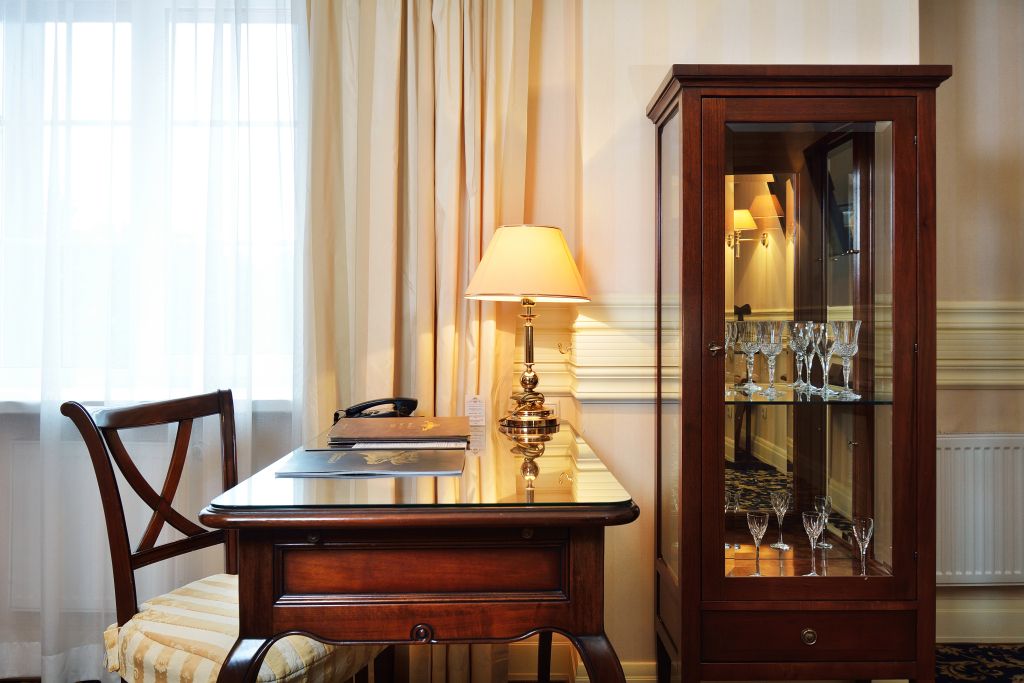 Интерьер номера выполнен в классическом стиле с использованием двух вариаций отделки - «мужской» и «женской». Авторский дизайн, современная техника и отличная мебель из массива дерева.