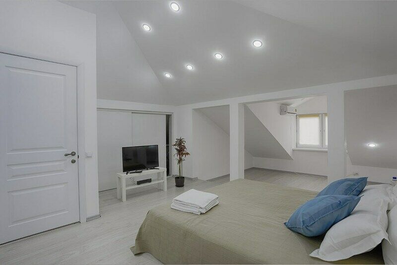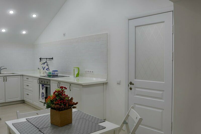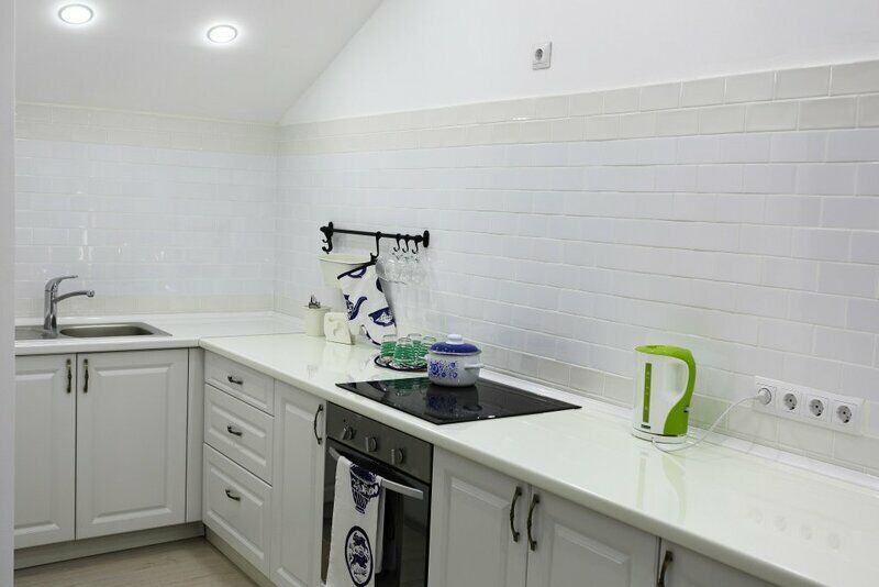кухонная зона, оборудованная плитой, холодильником, посудой, телевизор, ванна или душевая, кондиционер