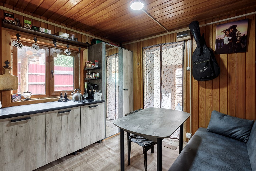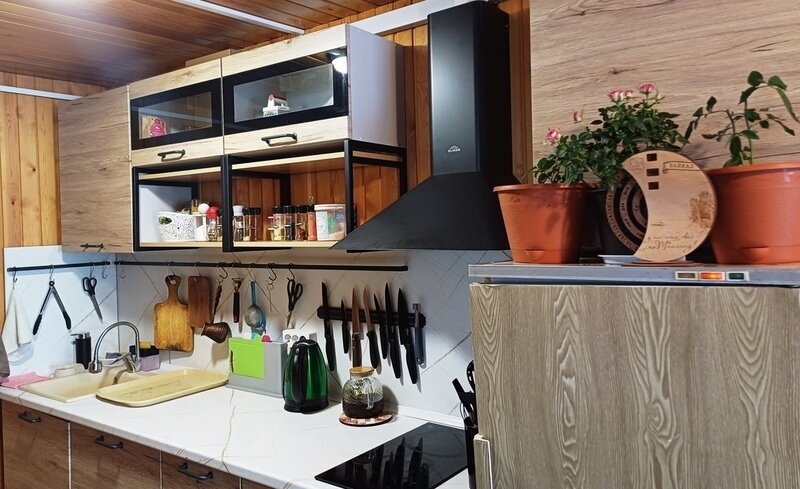 Гости смогут самостоятельно готовить любимые блюда, так как кухня в доме оборудована плитой, холодильником, чайником и набором посуды. Также имеется мангальная зона.
