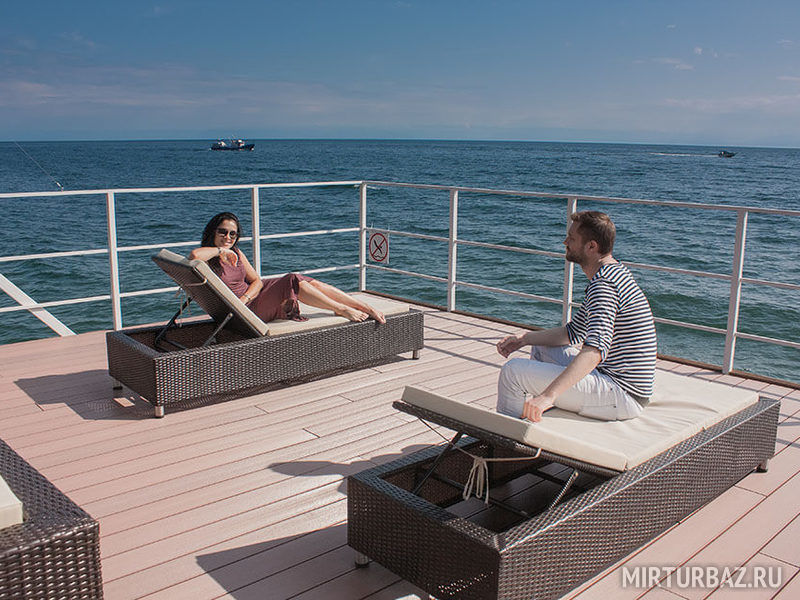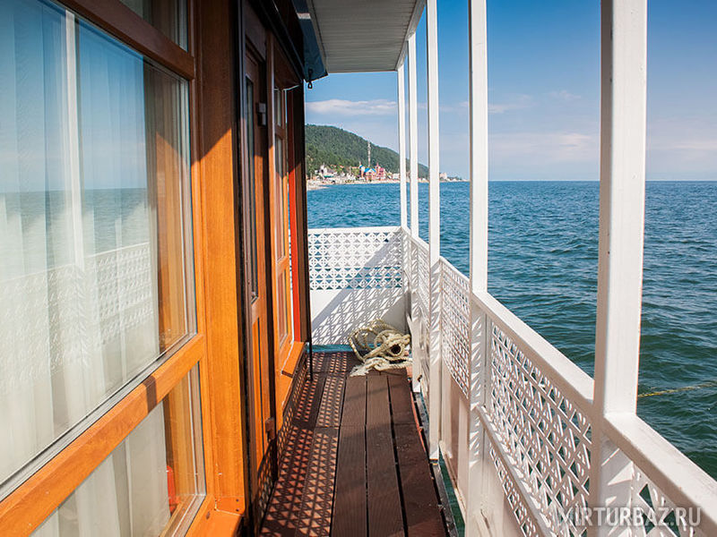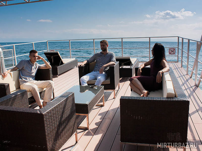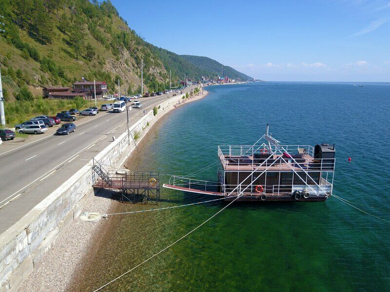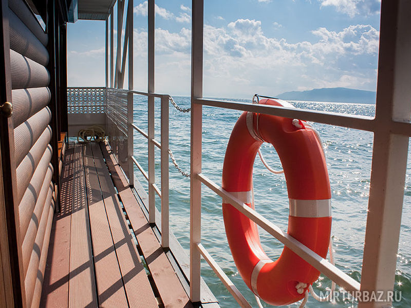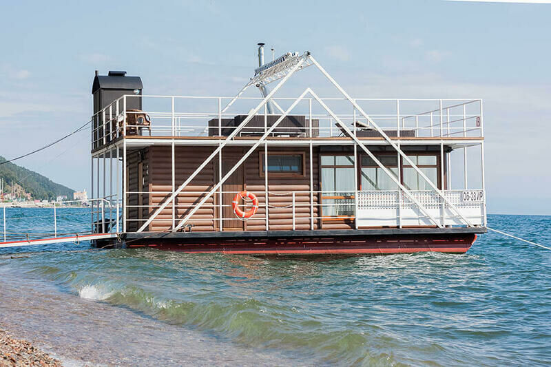 Вы можете попариться в бане на воде. А затем прямо из парной окунуться в прохладную воду Байкала. В просторной комнате отдыха вам преложат чай из сибирских трав. На втором этаже расположена тендовая палуба.