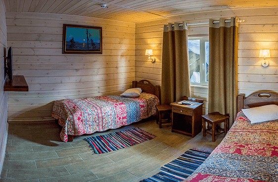Номер с двуспальными кроватями, санузлом и душевой кабиной. В номере есть плазменный телевизор со спутниковыми каналами (130 каналов), тумбочка, фен, электрический чайник, зеркало и косметический столик. Вид на озеро Байкал.