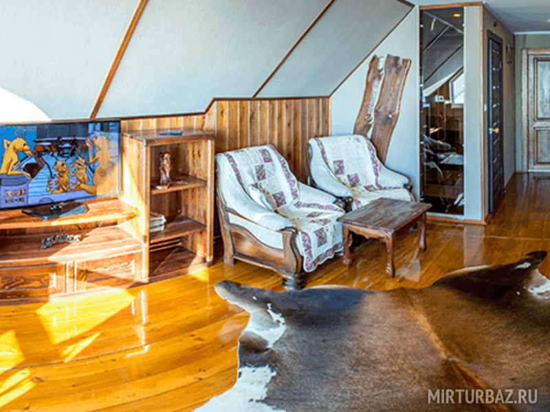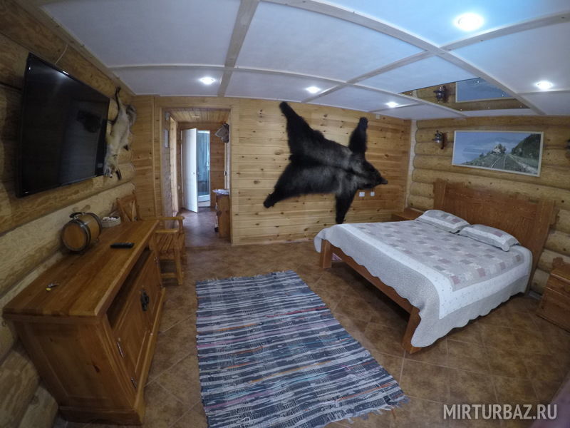 Просторный номер с одной двуспальной и одной односпальной кроватями. В номере есть шкаф для одежды, зеркало, тумбочки, косметический столик, фен, электрический чайник, два кресла с журнальным столиком, плазменный телевизор со спутниковыми каналами (130 каналов), холодильник, балкон с плетёной мебелью с видом на Байкал, душ, туалет.