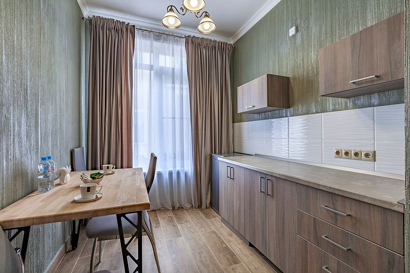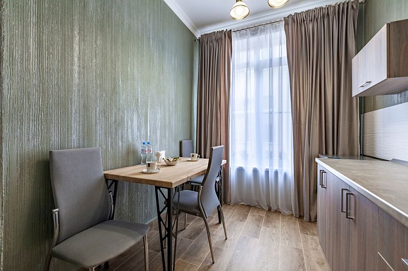 Студия улучшенная площадью сорок девять квадратных метров с видом во двор. Подходит для размещения четырех человек (три основных места и одно дополнительное). Имеет спальню с приятным интерьером.
